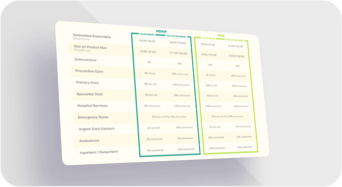 HDHP PPO IN-NETWORK OUT-OF-NETWORK IN-NETWORK OUT-OF-NETWORK Embedded Deductible $3,200 / $6,400 $9,000 / $18,000 $2,500 / $7,500 $7,500 / $22,500 (Single/Family) Out-of-Pocket Max $3,800 / $7,600 $11,400 / $22,800 $6,000 / $12,000 $18,000 / $36,000 (Single/Family) Coinsurance 0% 30% 20% 40% Preventive Care No charge 30% coinsurance No charge 40% coinsurance Primary Care $30 per visit 30% coinsurance $30 per visit 40% coinsurance Specialist Visit $50 per visit 30% coinsurance $50 per visit 40% coinsurance Hospital Services 0% coinsurance 30% coinsurance 20% coinsurance 40% coinsurance Emergency Room $250 per visit then 0% coinsurance $250 per visit then 20% coinsurance Urgent Care Centers $75 per visit 30% coinsurance $75 per visit 40% coinsurance Ambulance 0% coinsurance 0% coinsurance 20% coinsurance 20% coinsurance Inpatient / Outpatient 0% coinsurance 30% coinsurance 20% coinsurance 40% coinsurance