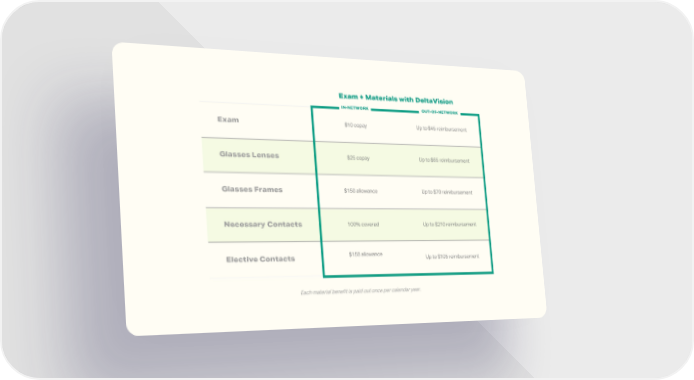 Exam + Materials with DeltaVision IN-NETWORK OUT-OF-NETWORK Exam $10 copay Up to $45 reimbursement Glasses Lenses $25 copay Up to $65 reimbursement Glasses Frames $150 allowance Up to $70 reimbursement Necessary Contacts 100% covered Up to $210 reimbursement Elective Contacts $150 allowance Up to $105 reimbursement Each material benefit is paid out once per calendar year.