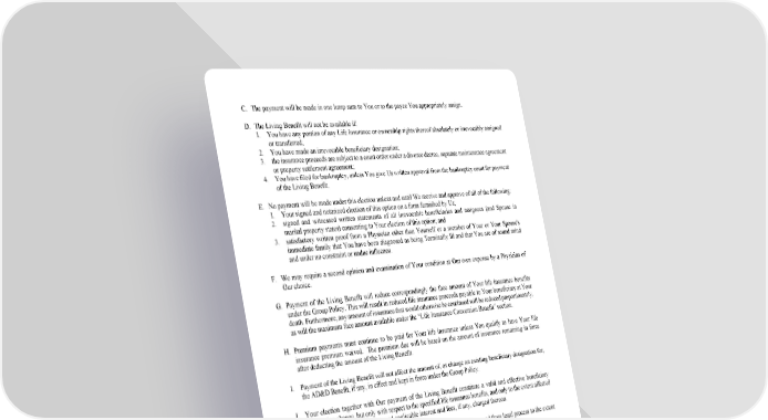 13 C. The payment will be made in one lump sum to You or to the payee You appropriately assign. D. The Living Benefit will not be available if: 1. You have any portion of any Life Insurance or ownership rights thereof absolutely or irrevocably assigned or transferred; 2. You have made an irrevocable beneficiary designation; 3. the insurance proceeds are subject to a court order under a divorce decree, separate maintenance agreement or property settlement agreement; 4. You have filed for bankruptcy, unless You give Us written approval from the bankruptcy court for payment of the Living Benefit. E. No payment will be made under this election unless and until We receive and approve of all of the following: 1. Your signed and notarized election of this option on a form furnished by Us; 2. signed and witnessed written statements of all irrevocable beneficiaries and assignees (and Spouse in marital property states) consenting to Your election of this option; and 3. satisfactory written proof from a Physician other than Yourself or a member of Your or Your Spouse's immediate family that You have been diagnosed as being Terminally Ill and that You are of sound mind and under no constraint or undue influence. F. We may require a second opinion and examination of Your condition at Our own expense by a Physician of Our choice. G. Payment of the Living Benefit will reduce correspondingly the face amount of Your life insurance benefits under the Group Policy. This will result in reduced life insurance proceeds payable to Your beneficiary at Your death. Furthermore, any amount of insurance that would otherwise be continued will be reduced proportionately, as will the maximum face amount available under the “Life Insurance Conversion Benefit” section. H. Premium payments must continue to be paid for Your life insurance unless You qualify to have Your life insurance premium waived. The premium due will be based on the amount of insurance remaining in force after deducting the amount of the Living Benefit. I. Payment of the Living Benefit will not affect the amount of, or change an existing beneficiary designation for, the AD&D Benefit, if any, in effect and kept in force under the Group Policy. J. Your election together with Our payment of the Living Benefit constitute a valid and effective beneficiary designation change, but only with respect to the specified life insurance benefits, and only to the extent affected by the Living Benefit payment, and applicable interest and fees, if any, charged thereon. K. Payment of the Living Benefit will be exempt from the claims of creditors and from legal process to the extent permitted by law. L. All other provisions of the Group Policy, including the effective date provisions of any benefit increases and the provisions on benefit reductions because of amendments to the plan or benefit classification changes or Your attained age, remain valid and in effect. Any such life insurance benefit reduction will be calculated based on Your life insurance amount in effect immediately before the Living Benefit payment. M. You are responsible for any tax consequences related to this benefit.