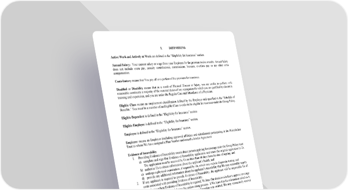 5 I. DEFINITIONS Active Work and Actively at Work are defined in the “Eligibility for Insurance” section. Annual Salary: Your current salary or wage from your Employer for the previous twelve months. Annual Salary does not include extra pay, annuity contributions, commissions, bonuses, overtime pay or any other extra compensation. Contributory means that You pay all or a portion of the premium for insurance. Disabled or Disability means that as a result of Physical Disease or Injury, you are unable to perform with reasonable continuity a majority of the material duties of any occupation for which you are qualified by education, training and experience, and you are under the Regular Care and Attendance of a Physician. Eligible Class means an employment classification defined by the Employer and specified in the “Schedule of Benefits.” You must be a member of an Eligible Class in order to be eligible for insurance under the Group Policy. Eligible Dependent is defined in the “Eligibility for Insurance” section. Eligible Employee is defined in the “Eligibility for Insurance” section. Employee is defined in the “Eligibility for Insurance” section. Employer means an Employer (including approved affiliates and subsidiaries) participating in the Policyholder Trust to whom We have assigned a Plan Number and issued a Joinder Agreement. Evidence of Insurability 1. Providing Evidence of Insurability means that a person applying for coverage under the Group Policy must: a) complete and sign Our Evidence of Insurability application and return the original application to Us. The application must be received by Us no later than 60 days from the date of signing; and b) authorize Us to obtain information about the applicant’s health; and c) undergo a physical examination, if required by Us, which may include diagnostic testing; and d) provide any additional information about the applicant’s insurability that We may reasonably require. 2. If any applicant is required to provide Evidence of Insurability, the applicant will be responsible for all costs associated with providing Evidence of Insurability. 3. In each case where Evidence of Insurability is required, We base Our decision whether to approve coverage on the information provided during the underwriting process. If We learn that the information relied on to approve coverage was incorrect, or that relevant information was omitted, We may retroactively rescind coverage and deny claims. Group Policy (Policy) means the group insurance Policy issued by Us to the Policyholder under a specified Plan Number. Guarantee Issue is the amount of coverage provided which is not subject to Evidence of Insurability. Hospital means a legally operated Facility providing full-time medical care and treatment under the direction of a full-time staff of licensed Physicians, but not including rest homes, nursing homes, convalescent homes, homes for the aged and facilities primarily affording custodial, educational, or rehabilitative care. Injury: Bodily Injury due to an Accident which: (1) results directly and independently of disease, bodily infirmity or any other causes; (2) solely, directly and independently of all other causes results in medical expense; (3) occurs after the effective date of the Insured Person's coverage; and (4) occurs while the Insured Person's coverage is in force. All Injuries sustained in any one Accident, including all related conditions and recurrent symptoms of these Injuries, are considered a single Injury.