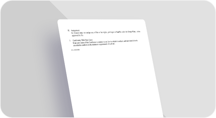 21 H. Assignment An Insured may not assign any of his or her rights, privileges or benefits under the Group Policy, unless approved by Us. I. Conformity With State Laws If any provision of this Certificate is contrary to any law to which it is subject, such provision is hereby amended to conform to the minimum requirements of such law. GTL-C2300-0608