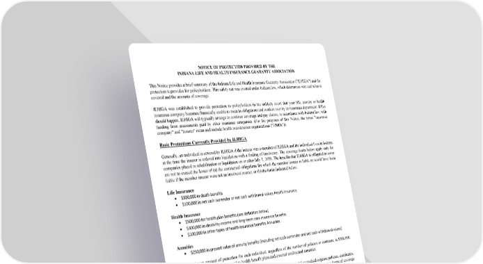 NOTICE OF PROTECTION PROVIDED BY THE INDIANA LIFE AND HEALTH INSURANCE GUARANTY ASSOCIATION This Notice provides a brief summary of the Indiana Life and Health Insurance Guaranty Association ("ILHIGA") and the protection it provides for policyholders. This safety net was created under Indiana law, which determines who and what is covered and the amounts of coverage. ILHIGA was established to provide protection to policyholders in the unlikely event that your life, annuity or health insurance company becomes financially unable to meet its obligations and is taken over by its insurance department. If this should happen, ILHIGA will typically arrange to continue coverage and pay claims, in accordance with Indiana law, with funding from assessments paid by other insurance companies. (For the purposes of this Notice, the terms "insurance company" and "Insurer" mean and include health maintenance organizations ("HMOs")). Basic Protections Currently Provided by ILHIGA Generally, an individual is covered by ILHIGA if the insurer was a member of ILHIGA and the individual lives in Indiana at the time the insurer is ordered into liquidation with a finding of insolvency. The coverage limits below apply only for companies placed in rehabilitation or liquidation on or after July 1, 2018. The benefits that ILHIGA is obligated to cover are not to exceed the lesser of (a) the contractual obligations for which the member insurer is liable or would have been liable if the member insurer were not an insolvent insurer, or (b) the limits indicated below: Life Insurance $300,000 in death benefits $100,000 in net cash surrender or net cash withdrawal values Health Insurance Health Insurance $500,000 for health plan benefits (see defini�on below) $300,000 in disability income and long-term care insurance benefits $100,000 in other types of health insurance benefits Annui�es Annuities $250,000 in present value of annuity benefits (including net cash surrender and net cash withdrawal values) The maximum amount of protection for each individual, regardless of the number of policies or contracts, is $300,000. Special rules may apply with regard to health benefit plans and covered unallocated annuities. "Health benefit plan" is defined in IC 27-8-8-2(0), and generally includes hospital or medical expense policies, certificates, HMO subscriber contracts or certificates or other similar health contracts that provide comprehensive forms of coverage for hospitalization or medical services, but excludes policies that provide coverages for limited benefits (such as accident- only, credit, dental only or vision-only insurance), Medicare Supplement insurance, disability income insurance and long- term care insurance. The protections listed above apply only to the extent that benefits are payable under covered policy(s). In no event will the ILHIGA provide benefits greater than the contractual obligations in the life, annuity or health insurance policy or contract. The statutory limits on ILHIGA coverage have changed over the years and coverage in prior years may not be the same as that set forth in this Notice. Note: Certain policies and contracts may not be covered or fully covered. For example, coverage does not extend to any portion(s) of a policy or contract that the insurer does not guarantee, such as certain investment additions to the account value of a variable life insurance policy or variable annuity contract.
