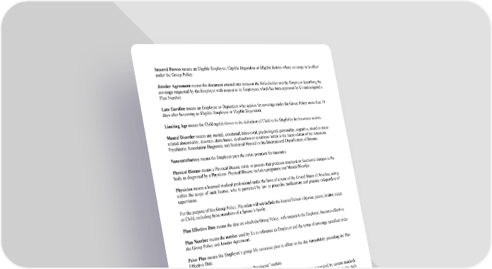 6 Insured Person means an Eligible Employee, Eligible Dependent or Eligible Retiree whose coverage is in effect under the Group Policy. Joinder Agreement means the document entered into between the Policyholder and the Employer describing the coverage requested by the Employer with respect to its Employees, which has been approved by Us and assigned a Plan Number. Late Enrollee means an Employee or Dependent who applies for coverage under the Group Policy more than 31 days after becoming an Eligible Employee or Eligible Dependent. Limiting Age means the Child age(s) shown in the definition of Child in the Eligibility for Insurance section. Mental Disorder means any mental, emotional, behavioral, psychological, personality, cognitive, mood or stress related abnormality, disorder, disturbance, dysfunction or syndrome listed in the latest edition of the American Psychiatric Association Diagnostic and Statistical Manual or the International Classification of Disease. Noncontributory means the Employer pays the entire premium for insurance. Physical Disease means a Physical Disease entity or process that produces structural or functional changes in the body as diagnosed by a Physician. Physical Disease includes pregnancy and Mental Disorder. Physician means a licensed medical professional under the laws of a state of the United States of America, acting within the scope of such license, who is permitted by law to prescribe medications and practice independent of supervision. For the purpose of this Group Policy, Physician will not include the Insured Person’s Spouse, parent, brother, sister, or Child, including these members of a Spouse’s family. Plan Effective Date means the date on which the Group Policy, with respect to the Employer, becomes effective. Plan Number means the number used by Us to reference an Employer and the terms of coverage specified under the Group Policy and Joinder Agreement. Prior Plan means the Employer’s group life insurance plan in effect on the day immediately preceding the Plan Effective Date. Proof of Loss is defined in the “Claims Provisions” section. Regular Care and Attendance means observation and treatment by a Physician as required by current standards of medicine for the Injury or Physical Disease causing a Disability, but in any event not less than one such observation per year. Retire and Retirement Date means the earlier of: 1. the date You Retire as such term is defined by Your Employer; 2. the date You receive or become eligible to receive, as defined by the Employer, retirement benefits under any pension plan to which the Employer contributes, 3. or the date You receive or become eligible to receive retirement benefits under, and as defined by, any state or federal retirement plan or under the Social Security Act or Railroad Retirement Act. 4. the date You reach the age defined in the “Schedule of Benefits”. You and Your means the Eligible Employee. Waiting Period for Insurance Coverage is defined in the “Eligibility for Insurance” and “Schedule of Benefits”.