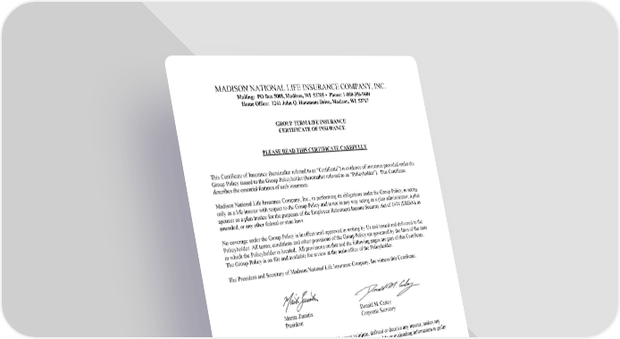 GTL-C600-0608M-IN 1 MADISON NATIONAL LIFE INSURANCE COMPANY, INC. Mailing: PO Box 5008, Madison, WI 53705 • Phone: 1-800-356-9601 Home Office: 1241 John Q. Hammons Drive, Madison, WI 53717 GROUP TERM LIFE INSURANCE CERTIFICATE OF INSURANCE PLEASE READ THIS CERTIFICATE CAREFULLY This Certificate of Insurance (hereinafter referred to as “Certificate”) is evidence of insurance provided under the Group Policy issued to the Group Policyholder (hereinafter referred to as “Policyholder”). This Certificate describes the essential features of such insurance. Madison National Life Insurance Company, Inc., in performing its obligations under the Group Policy, is acting only as a life insurer with respect to the Group Policy and is not in any way acting as a plan administrator, a plan sponsor or a plan trustee for the purposes of the Employee Retirement Income Security Act of 1974 (ERISA), as amended, or any other federal or state laws. No coverage under the Group Policy is in effect until approved in writing by Us and issued and delivered to the Policyholder. All terms, conditions and other provisions of the Group Policy are governed by the laws of the state in which the Policyholder is located. All provisions on this and the following pages are part of this Certificate. The Group Policy is on file and available for review at the main office of the Policyholder. The President and Secretary of Madison National Life Insurance Company, Inc witness this Certificate: Marita Zuraitis Donald M. Carley President Corporate Secretary WARNING: Any person who knowingly, and with intent to injure, defraud or deceive any insurer, makes any claim for the proceeds of an insurance policy containing any false, incomplete or misleading information is guilty of a felony.