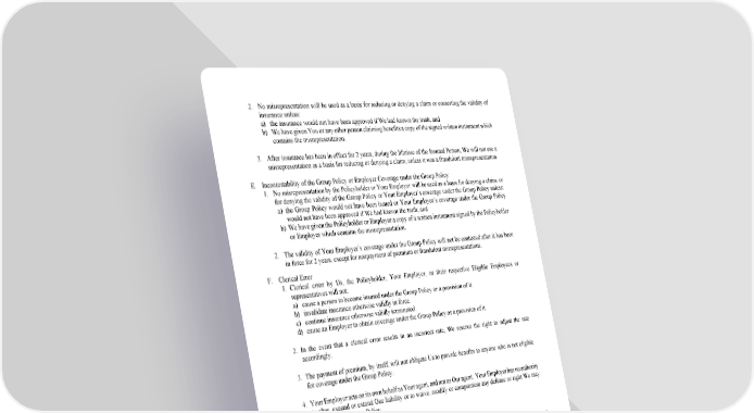 20 2. No misrepresentation will be used as a basis for reducing or denying a claim or contesting the validity of insurance unless: a) the insurance would not have been approved if We had known the truth; and b) We have given You or any other person claiming benefits a copy of the signed written instrument which contains the misrepresentation. 3. After insurance has been in effect for 2 years, during the lifetime of the Insured Person, We will not use a misrepresentation as a basis for reducing or denying a claim, unless it was a fraudulent misrepresentation. E. Incontestability of the Group Policy or Employer Coverage under the Group Policy 1. No misrepresentation by the Policyholder or Your Employer will be used as a basis for denying a claim, or for denying the validity of the Group Policy or Your Employer’s coverage under the Group Policy unless: a) the Group Policy would not have been issued or Your Employer’s coverage under the Group Policy would not have been approved if We had known the truth; and b) We have given the Policyholder or Employer a copy of a written instrument signed by the Policyholder or Employer which contains the misrepresentation. 2. The validity of Your Employer’s coverage under the Group Policy will not be contested after it has been in force for 2 years, except for nonpayment of premium or fraudulent misrepresentations. F. Clerical Error 1. Clerical error by Us, the Policyholder, Your Employer, or their respective Eligible Employees or representatives will not: a) cause a person to become insured under the Group Policy or a provision of it. b) invalidate insurance otherwise validly in force. c) continue insurance otherwise validly terminated. d) cause an Employer to obtain coverage under the Group Policy or a provision of it. 2. In the event that a clerical error results in an incorrect rate, We reserve the right to adjust the rate accordingly. 3. The payment of premium, by itself, will not obligate Us to provide benefits to anyone who is not eligible for coverage under the Group Policy. 4. Your Employer acts on its own behalf as Your agent, and not as Our agent. Your Employer has no authority to alter, expand or extend Our liability or to waive, modify or compromise any defense or right We may have under the Group Policy. G. Misstatement 1. Age or Gender If the age or gender, or both, of a person has been misstated, We will make an equitable adjustment of premiums, benefits or both. The adjustment will be based on: a) the amount of insurance based on the correct age and gender; and b) the difference between the premiums paid and the premiums which would have been paid if the age and gender had been correctly stated. 2. A legal action may not be brought to recover on this Certificate within 60 days after written Proof of Loss has been given as required. No such action may be brought after 3 years from the time written proof was required to be given.