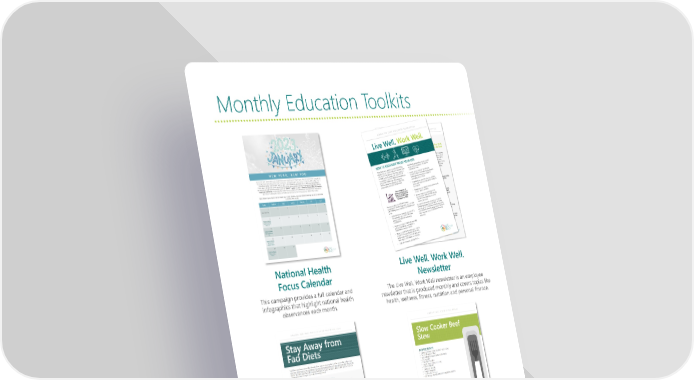 Monthly Education Toolkits National Health Live Well. Work Well. Focus Calendar Newsletter This campaign provides a full calendar and The Live Well, Work Well newsletter is an employee infographics that highlight national health newsletter that is produced monthly and covers topics like observances each month. health, wellness, fitness, nutrition and personal finance. Prevention Education Healthy, Inexpensive, Poster Campaign & Easy Recipes Every month, this campaign distributes a different Every month, this campaign distributes a poster that is designed to help educate employees healthy recipe from the government’s MyPlate on prevention-related health and wellness topics. recipe website to help promote healthy eating. Page 5 VISION EDUCATION SOLUTIONS