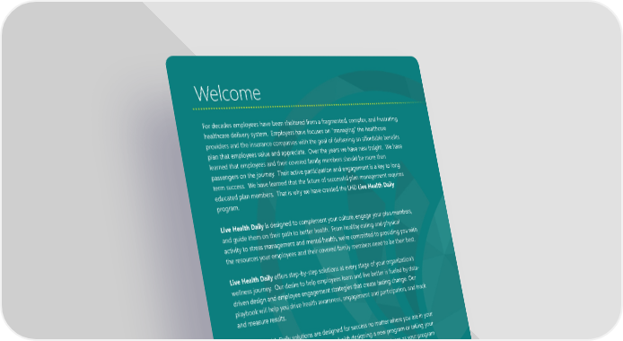 Welcome For decades employees have been sheltered from a fragmented, complex, and frustrating healthcare delivery system. Employers have focuses on "managing" the healthcare providers and the insurance companies with the goal of delivering an affordable benefits plan that employees value and appreciate. Over the years we have new insight. We have learned that employees and their covered family members should be more than passengers on the journey. Their active participation and engagement is a key to long term success. We have learned that the future of successful plan management requires educated plan members. That is why we have created the LHD Live Health Daily program. Live Health Daily is designed to complement your culture, engage your plan members, and guide them on their path to better health. From healthy eating and physical activity to stress management and mental health, we're committed to providing you with the resources your employees and their covered family members need to be their best. Live Health Daily offers step-by-step solutions at every stage of your organization’s wellness journey. Our desire to help employees learn and live better is fueled by data- driven design and employee engagement strategies that create lasting change. Our playbook will help you drive health awareness, engagement and participation, and track and measure results. The Live Health Daily solutions are designed for success no matter where you are in your wellness journey. Whether we are charged with designing a new program or taking your existing program to the next level, we are here to grow with your team as your program matures, elevate the employee experience, and continuously improve. Together we can make a difference. Let us take you, your members, and the health of your organization to the next level. Susan Van Hoosen, CHC, CCWS Wellness Program Manager Page 2 VISION EDUCATION SOLUTIONS