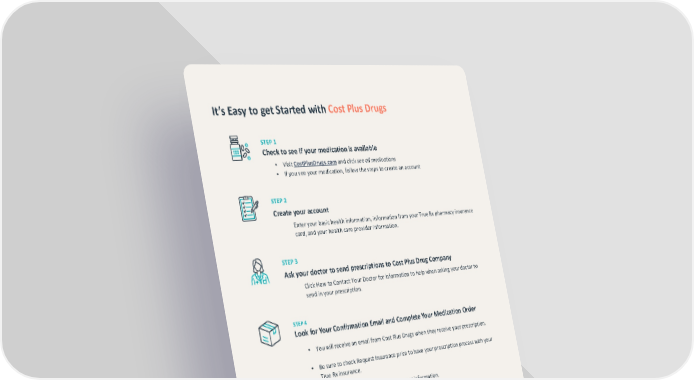 It’s Easy to get Started with Cost Plus Drugs STEP 1 Check to see if your medication is available • Visit CostPlusDrugs.com and click see all medications • If you see your medication, follow the steps to create an account STEP 2 Create your account Enter your basic health information, information from your True Rx pharmacy insurance card, and your health care provider information. STEP 3 Ask your doctor to send prescriptions to Cost Plus Drug Company Click How to Contact Your Doctor for information to help when asking your doctor to send in your prescription. STEP 4 Look for Your Confirmation Email and Complete Your Medication Order • You will receive an email from Cost Plus Drugs when they receive your prescription. • Be sure to check Request Insurance price to have your prescription process with your True Rx insurance. • Enter your shipping address and payment information. • Your medication will be shipped to your doorstep. Questions about your benefits? Contact the True Rx Patient Care Team at 866-921-2024 | Mon – Fri, 8 am to 8 pm ET