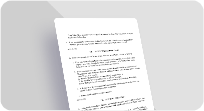 13 Group Policy. However, no benefits will be payable to you under the Group Policy if any benefits are payable to you under the Prior Plan. C. If you were eligible for insurance under the Prior Plan for more than 31 days but were not insured under the Prior Plan, you must provide Evidence of Insurability and be approved by us to become insured. GLDI-C1100-(12/06) VII. REINSTATEMENT OF COVERAGE A. If your coverage ends, you may become covered again as an Insured Person, subject to the following: 1. If you cease to be an Eligible Person and coverage ends, and then you return to Active Work with the Employer again within 3 months, the Waiting Period will be waived on the first day of your return to Active Work and you will not have to provide Evidence of Insurability. 2. If your coverage ends because you fail to make the required contribution while on an approved Family Medical Leave Act (FMLA) leave of absence, and then you return to Active Work and enroll for coverage within 31 days of the earlier of: a) the end of the period of leave you and your Employer agreed upon; or b) the end of the 12 week period following the date your leave began, then the Waiting Period will be waived and you will not have to provide Evidence of Insurability. 3. In all other cases, if your coverage ends because you fail to make the required contribution, you must provide Evidence of Insurability to become covered again. 4. In no event will insurance coverage be retroactive. GLDI-C1200-(12/06) VIII. DEFINITION OF DISABILITY A. During the Elimination Period, Disability and Disabled mean you are, as a result of Physical Disease, Injury, Mental Disorder, Substance Abuse or Pregnancy, unable to perform a majority of the Material Duties of your Own Occupation. B. During your Own Occupation Period, Disability and Disabled mean you are, as a result of Physical Disease, Injury, Mental Disorder, Substance Abuse or Pregnancy, unable to perform one or more of the Material Duties of your Own Occupation, and, due to such inability, your Work Earnings are less than 80% of your Predisability Earnings, and you are incapable of earning 80% or more of your Predisability Earnings. Your Work Earnings may be Deductible Income. See the “LTD Benefit Calculation” and “Deductible Income” sections. C. After your Own Occupation Period ends, Disability and Disabled mean you are, as a result of Physical Disease, Injury, Mental Disorder, Substance Abuse or Pregnancy, unable to perform one or more of the Material Duties of Any Occupation, and, due to such inability, your Work Earnings are less than 80% of your Predisability Earnings, and you are incapable of earning 80% or more of your Predisability Earnings. Your Work Earnings may be Deductible Income. See the “LTD Benefit Calculation” and “Deductible Income” sections.