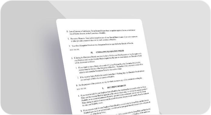 14 D. Loss of License or Certification. For an Insured Person whose occupation requires a license, a restriction or loss of license does not, in itself, constitute a Disability. E. Preventive Measures. Your inability to perform any of your Material Duties because of preventive treatments or other preventive measures does not, by itself, constitute a Disability. F. Your Own Occupation Period and Any Occupation Period are specified in the Schedule of Benefits. GLDI-C1300-(12/06) IX. CUMULATIVE ELIMINATION PERIOD A. If, during the Elimination Period, you return to Active Work at your Own Occupation or Any Occupation with your Employer and you then become Disabled again from the same or related cause(s), the Elimination Period will be determined as follows: 1. If your return to Active Work is for a total of 15 or less Working Days, the Elimination Period will be counted from the first day of the first period of Disability. The number of days you return to work will be added to and extend the Elimination Period by that number of days. 2. If the return to Active Work is for a total of more than 15 Working Days, the Elimination Period will start over and apply in full to the new period of Disability. B. For the purposes of this provision, any day for which you receive pay will be considered a working day. GLDI-C1400-(12/06) X. RECURRENT DISABILITY A. If you return to work for your Employer from a Disability for which benefits were payable under the Group Policy and then become Disabled again due to the same or related cause, we will treat the separate periods of Disability as one period of continuous Disability, provided you are continuously insured under the Group Policy during the period of recovery and the period of recovery does not exceed 3 months. Benefits resume on the date your Disability recurs. B. If you return to work for your Employer from a Disability covered under the Group Policy and then become Disabled again due to an unrelated cause, we will treat the subsequent Disability as a new claim, subject to all of the terms of the Group Policy. C. If you return to work for your Employer from a Disability covered under the Group Policy and then become Disabled again more than 3 months after you return to work, the subsequent Disability will be treated as a new claim, subject to all of the terms of the Group Policy. D. For the purposes of this provision, if your occupation with the Employer does not allow you to be Actively at Work for the entire calendar year due to a seasonal or regularly scheduled employment break, we will consider you to have returned to work if you would have been able to return to work had work been regularly scheduled. GLDI-C1500-(12/06)