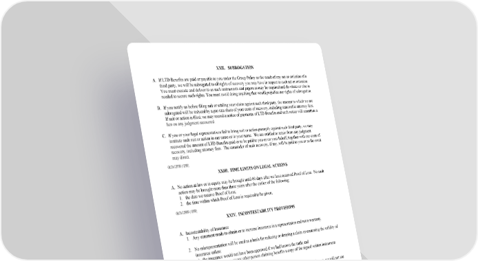 24 XXII. SUBROGATION A. If LTD Benefits are paid or payable to you under the Group Policy as the result of any act or omission of a third party, we will be subrogated to all rights of recovery you may have in respect to such act or omission. You must execute and deliver to us such instruments and papers as may be required and do whatever else is needed to secure such rights. You must avoid doing anything that would prejudice our rights of subrogation. B. If you notify us before filing suit or settling your claim against such third party, the amount to which we are subrogated will be reduced by a pro rata share of your costs of recovery, including reasonable attorney fees. If suit or action is filed, we may record a notice of payments of LTD Benefits and such notice will constitute a lien on any judgment recovered. C. If you or your legal representatives fail to bring suit or action promptly against such third party, we may institute such suit or action in our name or in your name. We are entitled to retain from any judgment recovered the amount of LTD Benefits paid or to be paid to you or on your behalf, together with our costs of recovery, including attorney fees. The remainder of such recovery, if any, will be paid to you or as the court may direct. GLDI-C2700-(12/06) XXIII. TIME LIMITS ON LEGAL ACTIONS A. No action at law or in equity may be brought until 60 days after we have received Proof of Loss. No such action may be brought more than three years after the earlier of the following: 1. the date we receive Proof of Loss; 2. the time within which Proof of Loss is required to be given. GLDI-C2900-(12/06) XXIV. INCONTESTABILITY PROVISIONS A. Incontestability of Insurance 1. Any statement made to obtain or to increase insurance is a representation and not a warranty. 2. No misrepresentation will be used as a basis for reducing or denying a claim or contesting the validity of insurance unless: a) the insurance would not have been approved if we had known the truth; and b) we have given you or any other person claiming benefits a copy of the signed written instrument which contains the misrepresentation. 3. After insurance has been in effect for two years during the lifetime of the Insured Person, we will not use a misrepresentation as a basis for reducing or denying a claim, unless it was a fraudulent misrepresentation. B. Incontestability of the Group Policy or Employer Coverage under the Group Policy 1. Any statements made by the Policyowner to obtain the Group Policy or made by an Employer to obtain coverage under the Group Policy is a representation and not a warranty. 2. No misrepresentation by the Policyowner or your Employer will be used as a basis for denying a claim, or for denying the validity of the Group Policy or your Employer’s coverage under the Group Policy unless: a) the Group Policy would not have been issued or your Employer’s coverage under the Group Policy would not have been approved if we had known the truth; and b) we have given the Policyowner or Employer a copy of a written instrument signed by the Policyowner or Employer which contains the misrepresentation.