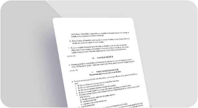 10 your Evidence of Insurability is approved by us, except that if such approval occurs on the first day of a month, such coverage becomes effective on that day. b) Where Evidence of Insurability is not required, an increase of existing coverage becomes effective on the date that you become eligible for such coverage. 3. If you are incapable of sustained Active Work due to a Disability on the day before the scheduled effective date of your insurance, such insurance will not become effective until the day after you are capable of sustained Active Work and complete one day of Active Work as an Eligible Person. GLDI-C800-(12/06) IV. WAIVER OF PREMIUM A. Premium payments are required during the Elimination Period. However, payment of premium is waived while LTD Benefits are payable. Upon your return to Active Work, premium payments will again be payable. GLDI-C900-(12/06) V. WHEN YOUR INSURANCE ENDS This provision applies to you if you are not Disabled. A. Except as otherwise provided for under this section, your coverage will cease on the earliest of the following dates: 1. the date your Employer's coverage under the Group Policy terminates; 2. the date you cease to be an Eligible Person; 3. the date that your premium payment is not paid when required; 4. the date you become eligible for coverage under another group long-term disability policy; 5. if you are a contract employee not returning to work as an Eligible Person the next contract year, the earlier of the following: a) the date you become employed with another employer; b) your Retirement Date; c) expiration of the current contract year; 6. your Retirement Date. B. Approved FMLA Leave of Absence - Contributory or Noncontributory Coverage 1. If you are on a FMLA leave, coverage will continue until the later of the leave period required by the Federal Family and Medical Leave Act of 1993, as amended, or the leave period required by applicable state law, provided that: a) the FMLA leave is approved in advance by the Employer and such approval includes documentation of the beginning and ending dates of the leave and the amount of your covered salary. Such documentation about your leave must be available to Us at Our request b) FMLA leaves of absence and the right to continue coverage during FMLA leaves are available to all Employees in the same Eligible Class under the Group Policy; and c) the Employer remits the required premium for coverage. 2. The Elimination Period can be satisfied and benefits may be payable during a FMLA leave subject to all other contract provisions. The benefit will be based on the lesser of your earnings in effect on your last full day of Active Work prior to the leave, or the salary for which premium was paid.