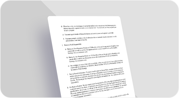 21 d) Where they exist, you must engage in appropriate medical and/or occupational rehabilitation programs that are reasonably expected to enable you to return to work. You must notify us when you participate in such a program. e) You must appeal denials of Deductible Income and actively pursue such appeals in good faith. f) You must promptly provide us with all information that we reasonably decide is necessary to verify and administer your claim for benefits. 2. Return to Work Responsibility a) During the Own Occupation Period, no LTD Benefits will be paid for any period of Disability when you are able to work in your Own Occupation and able to earn at least 80% of your Predisability Earnings, but you elect not to work. b) During the Any Occupation Period, no LTD Benefits will be paid for any period of Disability when you are able to work in Any Occupation and are able to earn at least 80% of your Predisability Earnings, but elect not to work. c) Any earnings you receive from work you perform, or that you could receive if you worked as much as you are able to considering your Disability, that are less than 100% of your Predisability Earnings will be treated as Work Earnings. 3. Duty to Furnish Information. To receive benefits under the Group Policy, you must authorize and direct medical care providers and sources of earnings or Deductible Income to provide us with all information and records that we reasonably determine to be relevant to the determination of benefits or eligibility for benefits. We do not pay fees charged for submitting this information to us. Any such costs will be your responsibility. B. Our Right to Examine. We may require you to be examined by a Physician, other medical practitioner and/or vocational expert of our choice, in addition to your obligation to be under the Regular Care of a Physician as specified above. In such case, we will pay for the additional examination. You must cooperate fully with the Physician, medical practitioner or vocational expert and give full effort to such examinations. We can require an examination as often as it is reasonable to do so. We may also require you to be interviewed by an authorized Company representative. C. Insured Person’s Failure to Comply 1. We have the right to suspend benefits during any portion of a Disability in which you fail to comply with any of the requirements set forth in this Certificate. 2. We have the further right to terminate irrevocably all further benefits under the Group Policy when benefits have been suspended for a period of 6 consecutive months due to your failure to comply with any of the requirements of the Group Policy. GLDI-C2400-(12/06) XX. CLAIMS A. Notice of Claim 1. Written notice of claim should be given to us within 20 days of the date the Elimination Period ends, if that is possible. If that is not possible, you must notify us as soon as it is reasonably possible to do so.