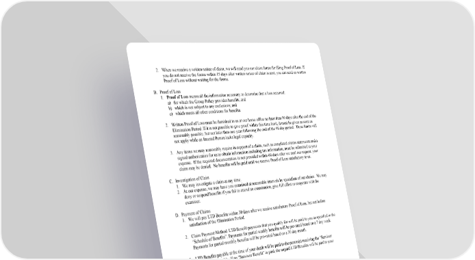 22 2. When we receive a written notice of claim, we will send you our claim forms for filing Proof of Loss. If you do not receive the forms within 15 days after written notice of claim is sent, you can send us written Proof of Loss without waiting for the forms. B. Proof of Loss 1. Proof of Loss means all the information necessary to determine that a loss occurred: a) for which the Group Policy provides benefits; and b) which is not subject to any exclusions; and c) which meets all other conditions for benefits. 2. Written Proof of Loss must be furnished to us at our home office no later than 90 days after the end of the Elimination Period. If it is not possible to give proof within this time limit, it must be given as soon as reasonably possible, but not later than one year following the end of the 90 day period. These limits will not apply while an Insured Person lacks legal capacity. 3. Any items we may reasonably require in support of a claim, such as completed claims statements and a signed authorization for us to obtain information including tax information, must be submitted at your expense. If the required documentation is not provided within 60 days after we mail our request, your claim may be denied. No benefits will be paid until we receive Proof of Loss satisfactory to us. C. Investigation of Claim 1. We may investigate a claim at any time. 2. At our expense, we may have you examined at reasonable intervals by specialists of our choice. We may deny or suspend benefits if you fail to attend an examination, give full effort or cooperate with the examiner. D. Payment of Claims 1. We will pay LTD Benefits within 30 days after we receive satisfactory Proof of Loss, but not before satisfaction of the Elimination Period. 2. Claim Payment Method. LTD Benefit payments that you qualify for will be paid to you as specified in the “Schedule of Benefits”. Payments for partial weekly benefits will be pro-rated based on a 7 day week. Payments for partial monthly benefits will be pro-rated based on a 30 day month. 3. LTD Benefits payable at the time of your death will be paid to the person(s) receiving the “Survivor Benefit” if applicable. If no “Survivor Benefit” is paid, the unpaid LTD Benefits will be paid to your estate. E. Notice of Adverse Decision on Claim 1. We will notify you of an adverse benefit determination within a reasonable period of time, but not later than 45 days after we receive satisfactory Proof of Loss. This period may be extended by us for up to 30 days, provided that we determine that such an extension is necessary due to matters beyond our control, and provided that we notify you prior to the end of the initial 45 day period, of the circumstances requiring the extension of time and the date by which we expect to render a decision. 2. If, prior to the end of the first 30 day extension period, we determine that, due to matters beyond our control, a decision cannot be rendered within that extension period, the period for making the determination may be extended for up to an additional 30 days, provided that we notify you prior to the expiration of the first 30 day extension period, of the circumstances requiring the extension and the date as of which we expect to render a decision. 3. In the case of any extension, the notice of extension will specifically explain the standards on which entitlement to a benefit is based, the unresolved issues that prevent a decision on the claim and the