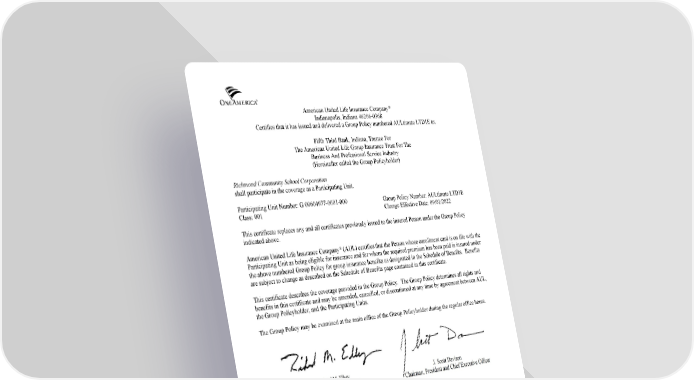 American United Life Insurance Company® Indianapolis, Indiana 46206-0368 Certifies that it has issued and delivered a Group Policy numbered AULtimate LTD1E to: Fifth Third Bank, Indiana, Trustee For The American United Life Group Insurance Trust For The Business And Professional Service Industry (Hereinafter called the Group Policyholder) Richmond Community School Corporation shall participate in the coverage as a Participating Unit. Participating Unit Number: G 00604977-0001-000 Group Policy Number: AULtimate LTD1E Class: 001 Change Effective Date: 09/01/2022 This certificate replaces any and all certificates previously issued to the insured Person under the Group Policy indicated above. American United Life Insurance Company® (AUL) certifies that the Person whose enrollment card is on file with the Participating Unit as being eligible for insurance and for whom the required premium has been paid is insured under the above numbered Group Policy for group insurance benefits as designated in the Schedule of Benefits. Benefits are subject to change as described on the Schedule of Benefits page contained in this certificate. This certificate describes the coverage provided in the Group Policy. The Group Policy determines all rights and benefits in this certificate and may be amended, cancelled, or discontinued at any time by agreement between AUL, the Group Policyholder, and the Participating Units. The Group Policy may be examined at the main office of the Group Policyholder during the regular office hours. CERTIFICATE OF INSURANCE GROUP LONG TERM DISABILITY INCOME INSURANCE 2003 GC 3100BNN(T) TITLE PAGE (Class 001) (LTD Plan)