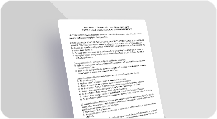 GC 3100.13-4 SECTION 5D - CONTINUATION OF PERSONAL INSURANCE DURING 2005 A LEAVE OF ABSENCE FOR ACTIVE MILITARY SERVICE (BME) SECTION 5D - CONTINUATION OF PERSONAL INSURANCE DURING A LEAVE OF ABSENCE FOR ACTIVE MILITARY SERVICE LEAVE OF ABSENCE means the Person is absent from Active Work for a temporary period of time that has been agreed to in advance in writing by the Participating Unit. CONTINUATION OF PERSONAL INSURANCE DURING A LEAVE OF ABSENCE FOR ACTIVE MILITARY SERVICE: If the Person is on a leave of absence for military service as described under the Uniformed Services Employment and Reemployment Rights Act of 1994 (USERRA) and applicable state law, the Person’s coverage may be continued until the later of: 1) the length of time the coverage may be continued under the Group Policy for an FMLA leave of absence; or 2) the length of time the coverage may be continued under the Group Policy for Leave of Absence other than an FMLA leave of absence. Coverage continued under this Section is subject to the following requirements: 1) applicable premiums must continue to be paid to AUL in accordance with the Group Policy (see Section 6 - Premium Payment); and 2) Basic Monthly Earnings will be the amount last reported to AUL in writing and in effect prior to the date the Person’s Leave of Absence for active military service began. Continuation of Personal Insurance under this provision will cease on the earliest of the following: 1) the date a Person dies; 2) the date a Person’s coverage terminates for nonpayment of premiums; 3) the date a Person begins full or part-time employment with another employer; 4) the date this Group Policy, or the Participating Unit’s coverage under the Group Policy, terminates; 5) the date a Person notifies the Participating Unit that he will not be returning to Active Work; 6) the date a Person’s class is no longer offered under the Group Policy; 7) the date a Person no longer qualifies for an eligible class, as stated on the Schedule of Benefits; or 8) the date a Person requests termination of coverage under the Group Policy, but not prior to the date of request. All terms and conditions of the Group Policy will apply during the approved continuation period provided under this Section, unless otherwise stated. While Personal Insurance is being continued under this Section, the Person will be considered exempt from the requirements listed below: 1) the Actively At Work definition; and 2) the applicable number of hours needed to meet the requirement for full-time Employee, as stated on the Schedule of Benefits. If the Participating Unit has approved more than one type of Leave of Absence for the Person during any one period, AUL will consider such leaves to be concurrent for the purpose of determining how long the Person’s coverage may continue under the Group Policy.