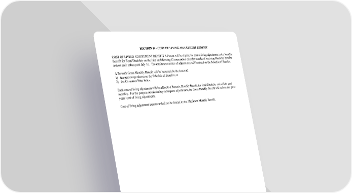 GC 3100.33B SECTION 14 - COST OF LIVING ADJUSTMENT BENEFIT 2005 (Gross) (12 months) SECTION 14 - COST OF LIVING ADJUSTMENT BENEFIT COST OF LIVING ADJUSTMENT BENEFIT A Person will be eligible for cost of living adjustments to the Monthly Benefit for Total Disability on the July 1st following 12 consecutive calendar months of receiving Disability benefits and on each subsequent July 1st. The maximum number of adjustments will be stated on the Schedule of Benefits. A Person's Gross Monthly Benefit will be increased by the lesser of: 1) the percentage shown on the Schedule of Benefits; or 2) the Consumer Price Index. Each cost of living adjustment will be added to a Person's Monthly Benefit for Total Disability and will be paid monthly. For the purpose of calculating subsequent adjustments, the Gross Monthly Benefit will include any prior years' cost of living adjustments. Cost of living adjustment increases shall not be limited by the Maximum Monthly Benefit.