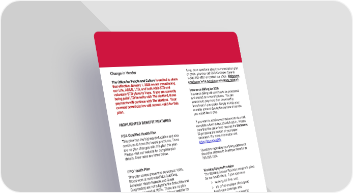 Change in Vendor The Office for People and Culture is excited to share that effective January 1, 2026 we are transitioning our Life, AD&D, LTD, and both ASO-STD and voluntary STD plans to Voya. If you are currently being paid LTD benefits with The Hartford, those payments will continue with The Hartford. Your current beneficiaries will remain valid for this plan. HIGHLIGHTED BENEFIT FEATURES HSA Qualified Health Plan This plan has the highest deductibles and also continues to have the lowest premiums. There are no plan changes with this plan this year. Please visit our website for complete plan details. New rates are listed below. PPO Health Plan This plan covers preventive services at 100%. Blood work at contracted labs (LabCorp, American Health Network and Quest Diagnostics) are not subject to the deductible and are also covered at 100%. There are no plan changes this year. Please visit our website for complete plan details. New rates are listed below. Prescription Benefits The University continues to use CVS Caremark as its third-party administrator for prescriptions. Register online at www.Caremark.com/startnow to find network pharmacies, refill medications, check order status, check drug cost, and see your prescription history. Specialty medications are becoming a huge cost driver to our plans. With Ball State’s health plan being self-funded, we strive for all plan members to check costs for prescriptions and see if lower-cost alternatives are available. By being good stewards of our insurance expenditures, we can all work to keep our health claims and insurance premiums low. If you have questions about your prescription plan or costs, you may call CVS Customer Care at 1-866-243-4881 or contact our office. Walgreens continues to be out of our pharmacy network. Insurance Billing for 2026 Insurance billing will continue to be processed and mailed on a monthly basis. You are welcome to pay more than one monthly installment if you prefer. Simply multiply your monthly amount due by the number of months you would like to pay. If you want to receive your statements via email, complete a form at bsu.edu/ebill-opt-in. Please note that this opt-in form requires the Statement ID printed at the bottom of your paper statement. For more information visit https://bsu.edu/eBill. Questions regarding your billing statements should be directed to Employee Benefits at 765-285-1834. Working Spouse Provision The Working Spouse Provision remains in effect for our health plans. If your spouse is: ➢ working full time, and; ➢ his or her employer offers group health care coverage, and; ➢ the employer funds at least 60 percent of the coverage, you cannot cover your spouse as a dependent on your medical plan unless he or she is also enrolled in his/her employer’s group health plan. It is important if your spouse has a change in employment that you complete and submit an updated Working Spouse Affidavit that is available online at www.bsu.edu/payroll under the Forms, Policies, and Guides tab.