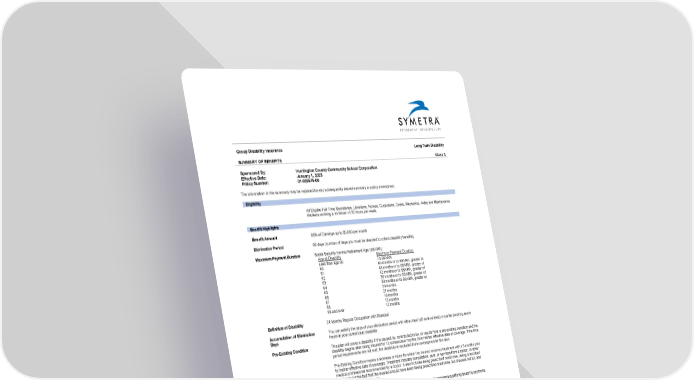 Group Disability Insurance Long Term Disability SUMMARY OF BENEFITS Class 3 Sponsored By: Huntington County Community School Corporation Effective Date: January 1, 2023 Policy Number: 01-020575-00 The information in this summary may be replaced by any subsequently issued summary or policy amendment. Eligibility All Eligible Full-Time Secretaries, Librarians, Nurses, Custodians, Cooks, Mechanics, Aides and Maintenance Workers working a minimum of 30 hours per week. Benefit Highlights Benefit Amount 60% of Earnings up to $5,000 per month Elimination Period 90 days (number of days you must be disabled to collect disability benefits) Maximum Payment Duration Social Security Normal Retirement Age (SSNRA): Age at Disability Maximum Payment Duration Less than age 60 To SSNRA 60 60 months or to SSNRA, greater of 61 48 months or to SSNRA, greater of 62 42 months or to SSNRA, greater of 63 36 months or to SSNRA, greater of 64 30 months or to SSNRA, greater of 65 24 months 66 21 months 67 18 months 68 15 months 69 and over 12 months Definition of Disability 24 Months Regular Occupation with Residual Accumulation of Elimination You can satisfy the days of your elimination period with either total (off work entirely) or partial (working some Days hours at your current job) disability. Pre-Existing Condition This plan will cover a disability if it is caused by, contributed to by, or results from a pre-existing condition and the disability begins after being insured for 12 consecutive months from his/her effective date of coverage. If the time period requirements are not met, the disability is excluded from coverage under the plan. Pre-Existing Condition means a sickness or injury for which the insured received treatment within 3 months prior to his/her effective date of coverage. Treatment includes consultation, care, or services from a doctor, or other medical professional recommended by a doctor. It also includes being prescribed medicines, taking prescribed medicines (or the fact that the insured should have been taking prescribed medicines, but chooses not to), and receiving diagnostic measures. Survivor Income Benefit A survivor benefit may be paid to your beneficiary if you should die while receiving qualifying disability payments. Benefit Limitations Mental Illness: 24 Months Per Lifetime Substance Abuse: 24 Months Per Lifetime Standard Provisions • Maternity is covered the same as any other condition. • 6 months recurrent disability/temporary recovery - If the insured recovers and returns to work, and the same sickness or injury causes the disability to occur again within 6 months of the date the prior disability ended, Symetra will resume monthly payments if the insured is covered under the policy for the period of temporary recovery. • Waiver of premium - Premium payments for coverage are suspended for an insured while he/she is receiving disability income payments under this policy. • Cost of living freeze - Except for increases in income earned (or received from any form of employment) once other income amounts have been subtracted from the gross monthly disability payment, the insured’s payment will not be further reduced due to a cost of living increase in any other income amounts. • Vocational rehabilitation - Provides assistance through services such as testing and training as well as job modification and placement. • Social Security assistance - Helps an insured obtain Social Security disability benefits. • Continuity of coverage This summary provides only a brief description of the Disability Income Insurance coverage insured by Symetra Life Insurance Company under the GDC 4000 series Group Disability Income Insurance policy. For a complete description, including all definitions, exclusions, limitations, and reductions in coverage, as well as information on termination of benefits, please contact your benefit administrator or refer to the Group Insurance Certificate you will receive when you become insured. Coverage will be offered under Group Policy number 01-020575-00. All benefits are subject to the terms and conditions of the Group Policy. If there is a difference between the information in this summary and the information contained in the Group Insurance Certificate, the terms of the Group Insurance Certificate will prevail. The terms of coverage may change over time; always refer to your current Group Insurance Certificate for information regarding your insurance benefits. Insured by Symetra Life Insurance Company Symetra® is a registered service mark of Symetra Life Insurance Company. LGP-2319/LTD-Class 3 2/17
