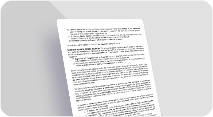 (6) Either the specific internal rules, guidelines, protocols, standards or other similar criteria of the plan that we relied upon in making the adverse decision, or, alternatively, a statement that such rules, guidelines, protocols, standards or other similar criteria of the plan do not exist; (7) A statement that the Insured is entitled to receive, upon request and free of charge, reasonable access to, and copies of, all documents, records, and other information relevant to a claim for benefits; and (8) Information concerning the Insured’s right to request that we review our decision. The notification will be provided in a culturally and linguistically appropriate manner. REVIEW OF ADVERSE BENEFIT DECISIONS: The Insured may appeal any adverse benefit decision we may make on all or part of the Insured’s claim. This appeal must be in writing and must be received by us no more than 180 days after the Insured receives notice of the adverse benefit decision. Only one appeal is allowed. As part of the appeal process, the Insured will: (1) Be provided with the opportunity to send us written comments, documents, records, and other information related to the Insured’s claim for benefits in conjunction with the Insured’s timely appeal; and (2) Be provided, upon request and free of charge, reasonable access to, and copies of, all non-privileged documents, records, and other information relating to the Insured’s claim for benefits. We will review the Insured’s appeal promptly after receiving the Insured’s request. We will advise the Insured of the results of our review within 45 days after we receive the Insured’s timely request for review, unless it is determined that special circumstances require an extension of time for processing the appeal. If it is determined that an extension of time for processing is required, we will give the Insured written notice of the extension prior to the termination of the initial 45- day period. In no event will such extension exceed a period of 45 days from the end of the initial period. The extension notice shall indicate the special circumstances requiring an extension of time and the date by which the determination on review is expected to be made. The period of time within which a benefit determination on review is required to be made shall begin at the time an appeal is timely filed, without regard to whether all the information necessary to make a benefit determination accompanies the filing. In the event that a period of time is extended as described above due to the Insured’s failure to submit information necessary to decide the claim, the period for making the benefit determination on review shall be tolled from the date on which the notification of the extension is sent to the Insured until the date on which the Insured responds to the request for additional information. Our decision on the Insured’s appeal will be in writing and will include the specific reason or reasons for the decision and reference to specific plan/Policy provisions on which the decision was based. For any adverse benefit decision on the Insured’s appeal, our notice will also include: (1) A statement that the Insured is entitled to receive, upon request and free of charge, reasonable access to, and copies of, all documents, records, and other information relevant to the Insured’s claim for benefits; (2) A description of the Insured’s right to bring a civil action under section 502(a) of the Employee Retirement Income Security Act of 1974 as amended ("ERISA") (where applicable), as well as a description of any applicable contractual limitations period that applies to the Insured’s right to bring such an action, including the calendar date on which the contractual limitations period expires for the claim; (3) A discussion of the decision, including an explanation of the basis for disagreeing with or not following: a. The views presented by the Insured to the plan of health care professionals treating the Insured and vocational professionals who evaluated the Insured; b. The views of medical or vocational experts whose advice was obtained on behalf of the plan in connection with the Insured’s adverse benefit decision, without regard to whether the advice was relied upon in making the benefit decision; and c. A disability determination regarding the Insured made by the Social Security Administration; and (4) Either the specific internal rules, guidelines, protocols, standards or other similar criteria of the plan that we relied upon in making the adverse decision, or, alternatively, a statement that such rules, guidelines, protocols, standards or other similar criteria of the plan do not exist; and (5) A statement that the Insured is entitled to receive, upon request and free of charge, reasonable access to, and copies of, all documents, records, and other information relevant to a claim for benefits. The notification will be provided in a culturally and linguistically appropriate manner. ARBITRATION OF CLAIMS: Any claim or dispute arising from or relating to our determination regarding the Insured’s Total Disability may be settled by arbitration when agreed to by the Insured and us in accordance with the Rules for Health and Accident Claims of the American Arbitration Association or by any other method agreeable to the Insured and LRS-6564-6-0719-IN Page 6.3