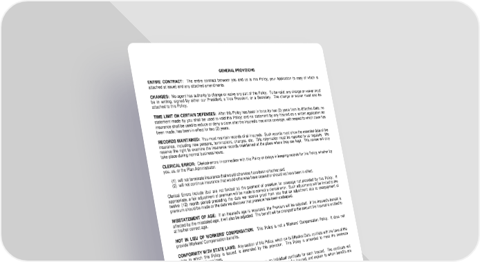 GENERAL PROVISIONS ENTIRE CONTRACT: The entire contract between you and us is this Policy, your Application (a copy of which is attached at issue) and any attached amendments. CHANGES: No agent has authority to change or waive any part of this Policy. To be valid, any change or waiver must be in writing, signed by either our President, a Vice President, or a Secretary. The change or waiver must also be attached to this Policy. TIME LIMIT ON CERTAIN DEFENSES: After this Policy has been in force for two (2) years from its Effective Date, no statement made by you shall be used to void this Policy; and no statement by any Insured on a written application for insurance shall be used to reduce or deny a claim after the Insured's insurance coverage, with respect to which claim has been made, has been in effect for two (2) years. RECORDS MAINTAINED: You must maintain records of all Insureds. Such records must show the essential data of the insurance, including new persons, terminations, changes, etc. This information must be reported to us regularly. We reserve the right to examine the insurance records maintained at the place where they are kept. This review will only take place during normal business hours. CLERICAL ERROR: Clerical errors in connection with this Policy or delays in keeping records for this Policy, whether by you, us, or the Plan Administrator: (1) will not terminate insurance that would otherwise have been effective; and (2) will not continue insurance that would otherwise have ceased or should not have been in effect. Clerical Errors include (but are not limited to) the payment of premium for coverage not provided by this Policy. If appropriate, a fair adjustment of premium will be made to correct a clerical error. Such adjustments will be limited to the twelve (12) month period preceding the date we receive proof from you that an adjustment due to overpayment of premium should be made or the date we discover that premium has been underpaid. MISSTATEMENT OF AGE: If an Insured's age is misstated, the Premium will be adjusted. If the Insured's benefit is affected by the misstated age, it will also be adjusted. The benefit will be changed to the amount the Insured is entitled to at his/her correct age. NOT IN LIEU OF WORKERS' COMPENSATION: This Policy is not a Workers' Compensation Policy. It does not provide Workers' Compensation benefits. CONFORMITY WITH STATE LAWS: Any section of this Policy, which on its Effective Date, conflicts with the laws of the state in which this Policy is issued, is amended by this provision. This Policy is amended to meet the minimum requirements of those laws. CERTIFICATE OF INSURANCE: We will send to you an individual certificate for each Insured. The certificate will outline the insurance coverage, state this Policy's provisions that affect the Insured, and explain to whom benefits are payable. TERMINATION OF THIS POLICY: You may cancel this Policy at any time by giving us written notice. This Policy will be cancelled on the date we receive your notice or, if later, the date requested in your notice. This Policy will terminate at the end of the Grace Period if Premium has not been paid by that date. We may cancel this Policy within thirty-one (31) days of written notice prior to the date of cancellation, only: (1) if the number of Insureds is less than the Minimum Participation Number shown on the Schedule of Benefits; or (2) if the percentage of Eligible Persons insured is less than the Minimum Participation Percentage shown on the Schedule of Benefits. You will still owe us any Premium that is not paid up to the date this Policy is cancelled. We will return, pro-rata, any part of the Premium paid beyond the date this Policy is cancelled. Termination of this Policy will not affect any claim which was covered prior to termination, subject to the terms and conditions of this Policy. LRS-6564-5-0516 Page 5.0