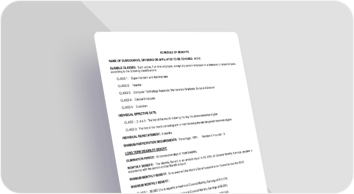 SCHEDULE OF BENEFITS NAME OF SUBSIDIARIES, DIVISIONS OR AFFILIATES TO BE COVERED: NONE ELIGIBLE CLASSES: Each active, Full-time employee, except any person employed on a temporary or seasonal basis, according to the following classifications: CLASS 1: Superintendent and Administrator CLASS 2: Teacher CLASS 3: Computer Technology Associate, Maintenance Employee, Nurse and Director CLASS 4: Clerical Employee CLASS 5: Custodian INDIVIDUAL EFFECTIVE DATE: CLASS 1, 2, 4 & 5: The first of the month following the day the person becomes eligible. CLASS 3: The first of the month coinciding with or next following the day the person becomes eligible. INDIVIDUAL REINSTATEMENT: 6 months MINIMUM PARTICIPATION REQUIREMENTS: Percentage: 100% Number of Insureds: 10 LONG TERM DISABILITY BENEFIT ELIMINATION PERIOD: 90 consecutive days of Total Disability. MONTHLY BENEFIT: The Monthly Benefit is an amount equal to 66 2/3% of Covered Monthly Earnings, payable in accordance with the section entitled Benefit Amount. MINIMUM MONTHLY BENEFIT: In no event will the Monthly Benefit payable to an Insured be less than $100. MAXIMUM MONTHLY BENEFIT: CLASS 1: $6,983 (this is equal to a maximum Covered Monthly Earnings of $10,474). CLASS 2: $4,167 (this is equal to a maximum Covered Monthly Earnings of $6,250). CLASS 3: $4,163 (this is equal to a maximum Covered Monthly Earnings of $6,244). CLASS 4 & 5: $2,780 (this is equal to a maximum Covered Monthly Earnings of $4,170). MAXIMUM DURATION OF BENEFITS: Benefits will not accrue beyond the longer of: the Duration of Benefits; or Normal Retirement Age; specified below: Age at Disablement Duration of Benefits (in years) 61 or less To Age 65 62 3 ½ 63 3 64 2 ½ 65 2 66 1 ¾ 67 1 ½ 68 1 ¼ 69 or more 1 LRS-6564-3-0889 Page 1.0