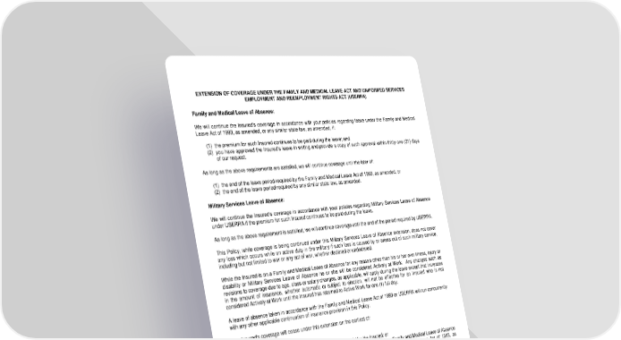 EXTENSION OF COVERAGE UNDER THE FAMILY AND MEDICAL LEAVE ACT AND UNIFORMED SERVICES EMPLOYMENT AND REEMPLOYMENT RIGHTS ACT (USERRA) Family and Medical Leave of Absence: We will continue the Insured's coverage in accordance with your policies regarding leave under the Family and Medical Leave Act of 1993, as amended, or any similar state law, as amended, if: (1) the premium for such Insured continues to be paid during the leave; and (2) you have approved the Insured's leave in writing and provide a copy of such approval within thirty-one (31) days of our request. As long as the above requirements are satisfied, we will continue coverage until the later of: (1) the end of the leave period required by the Family and Medical Leave Act of 1993, as amended; or (2) the end of the leave period required by any similar state law, as amended. Military Services Leave of Absence: We will continue the Insured’s coverage in accordance with your policies regarding Military Services Leave of Absence under USERRA if the premium for such Insured continues to be paid during the leave. As long as the above requirement is satisfied, we will continue coverage until the end of the period required by USERRA. This Policy, while coverage is being continued under this Military Services Leave of Absence extension, does not cover any loss which occurs while on active duty in the military if such loss is caused by or arises out of such military service, including but not limited to war or any act of war, whether declared or undeclared. While the Insured is on a Family and Medical Leave of Absence for any reason other than his or her own illness, injury or disability or Military Services Leave of Absence he or she will be considered Actively at Work. Any changes such as revisions to coverage due to age, class or salary changes, as applicable, will apply during the leave except that increases in the amount of insurance, whether automatic or subject to election, will not be effective for an Insured who is not considered Actively at Work until the Insured has returned to Active Work for one (1) full day. A leave of absence taken in accordance with the Family and Medical Leave Act of 1993 or USERRA will run concurrently with any other applicable continuation of insurance provision in this Policy. The Insured's coverage will cease under this extension on the earliest of: (1) the date this Policy terminates; or (2) the end of the period for which premium has been paid for the Insured; or (3) the date such leave should end in accordance with your policies regarding Family and Medical Leave of Absence and Military Services Leave of Absence in compliance with the Family and Medical Leave Act of 1993, as amended and USERRA. Coverage will not be terminated for an Insured who becomes Totally Disabled during the period of the leave and who is eligible for benefits according to the terms of this Policy. Any Monthly Benefit which becomes payable will be based on the Insured's Covered Monthly Earnings immediately prior to the date of Total Disability. Should you choose not to continue the Insured's coverage during a Family and Medical Leave of Absence and/or Military Services Leave of Absence, the Insured's coverage will be reinstated. LRS-6564-73-0708 Page 16.0