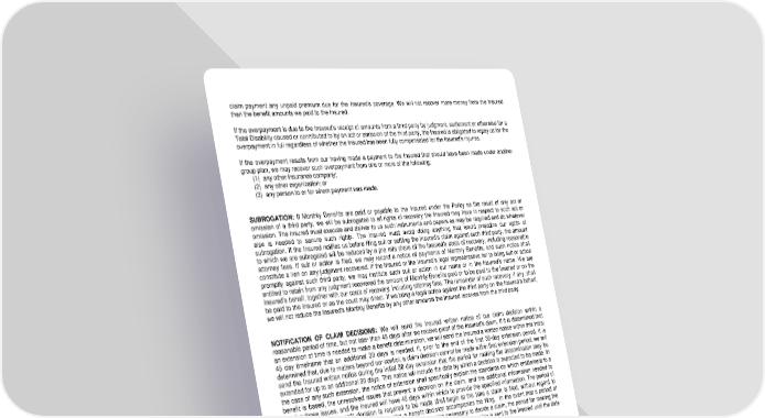 claim payment any unpaid premium due for the Insured’s coverage. We will not recover more money from the Insured than the benefit amounts we paid to the Insured. If the overpayment is due to the Insured’s receipt of amounts from a third party by judgment, settlement or otherwise for a Total Disability caused or contributed to by an act or omission of the third party, the Insured is obligated to repay us for the overpayment in full regardless of whether the Insured has been fully compensated for the Insured’s injuries. If the overpayment results from our having made a payment to the Insured that should have been made under another group plan, we may recover such overpayment from one or more of the following: (1) any other insurance company; (2) any other organization; or (3) any person to or for whom payment was made. SUBROGATION: If Monthly Benefits are paid or payable to the Insured under the Policy as the result of any act or omission of a third party, we will be subrogated to all rights of recovery the Insured may have in respect to such act or omission. The Insured must execute and deliver to us such instruments and papers as may be required and do whatever else is needed to secure such rights. The Insured must avoid doing anything that would prejudice our rights of subrogation. If the Insured notifies us before filing suit or settling the Insured’s claim against such third party, the amount to which we are subrogated will be reduced by a pro rata share of the Insured’s costs of recovery, including reasonable attorney fees. If suit or action is filed, we may record a notice of payments of Monthly Benefits, and such notice shall constitute a lien on any judgment recovered. If the Insured or the Insured’s legal representative fail to bring suit or action promptly against such third party, we may institute such suit or action in our name or in the Insured’s name. We are entitled to retain from any judgment recovered the amount of Monthly Benefits paid or to be paid to the Insured or on the Insured’s behalf, together with our costs of recovery, including attorney fees. The remainder of such recovery, if any, shall be paid to the Insured or as the court may direct. If we bring a legal action against the third party on the Insured’s behalf, we will not reduce the Insured’s Monthly Benefits by any other amounts the Insured receives from the third party. NOTIFICATION OF CLAIM DECISIONS: We will send the Insured written notice of our claim decision within a reasonable period of time, but not later than 45 days after we receive proof of the Insured’s claim. If it is determined that an extension of time is needed to make a benefit determination, we will send the Insured a written notice within this initial 45 day timeframe that an additional 30 days is needed. If, prior to the end of the first 30-day extension period, it is determined that, due to matters beyond our control, a claim decision cannot be made within that extension period, we will send the Insured written notice during the initial 30 day extension that the period for making the determination may be extended for up to an additional 30 days. This notice will include the date by which a decision is expected to be made. In the case of any such extension, the notice of extension shall specifically explain the standards on which entitlement to a benefit is based, the unresolved issues that prevent a decision on the claim, and the additional information needed to resolve those issues, and the Insured will have 45 days within which to provide the specified information. The period of time within which a benefit decision is required to be made shall begin at the time a claim is filed, without regard to whether all the information necessary to make a benefit decision accompanies the filing. In the event that a period of time is extended due to the Insured’s failure to submit information necessary to decide a claim, the period for making the benefit decision shall be tolled from the date on which the notification of the extension is sent to the Insured until the date on which the Insured responds to the request for additional information. For any adverse benefit decision, our notice will include: (1) The specific reason or reasons for such decision; (2) Reference to specific plan/Policy provisions on which the decision was based; (3) A description of the additional material or information necessary for the Insured to perfect the claim and an explanation of why such material or information is necessary; (4) A description of the review procedures and the time limits applicable to such procedures, including a statement of the Insured’s right to bring a civil action under section 502(a) of the Employee Retirement Income Security Act of 1974 as amended ("ERISA") (where applicable), following an adverse benefit decision; (5) A discussion of the decision, including an explanation of the basis for disagreeing with or not following: a) The views presented by the Insured to the plan of health care professionals treating the Insured and vocational professionals who evaluated the Insured; b) The views of medical or vocational experts whose advice was obtained on behalf of the plan in connection with the Insured’s adverse benefit decision, without regard to whether the advice was relied upon in making the benefit decision; and c) A disability determination regarding the Insured made by the Social Security Administration; LRS-6564-6-0719-IN Page 6.2