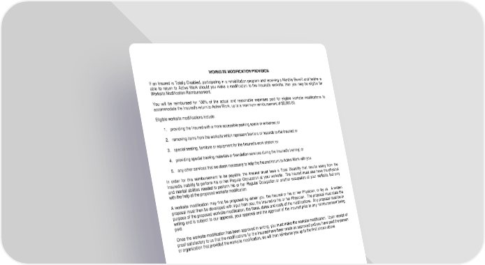 WORKSITE MODIFICATION PROVISION If an Insured is Totally Disabled, participating in a rehabilitation program and receiving a Monthly Benefit and he/she is able to return to Active Work should you make a modification to the Insured's worksite, then you may be eligible for Worksite Modification Reimbursement. You will be reimbursed for 100% of the actual and reasonable expenses paid for eligible worksite modifications to accommodate the Insured's return to Active Work, up to a maximum reimbursement of $2,000.00. Eligible worksite modifications include: 1. providing the Insured with a more accessible parking space or entrance; or 2. removing items from the worksite which represent barriers or hazards to the Insured; or 3. special seating, furniture or equipment for the Insured's work station; or 4. providing special training materials or translation services during the Insured's training; or 5. any other services that we deem necessary to help the Insured return to Active Work with you. In order for this reimbursement to be payable, the Insured must have a Total Disability that results solely from the Insured's inability to perform his or her Regular Occupation at your worksite. The Insured must also have the physical and mental abilities needed to perform his or her Regular Occupation or another occupation at your worksite, but only with the help of the proposed worksite modification. A worksite modification may first be proposed by either you, the Insured or his or her Physician, or by us. A written proposal must then be developed with input from you, the Insured or his or her Physician. The proposal must state the purpose of the proposed worksite modification, the times, dates and costs of the modifications. Any proposal must be in writing and is subject to our approval, your approval and the approval of the Insured prior to any reimbursement being paid. Once the worksite modification has been approved in writing, you must make the worksite modification. Upon receipt of proof satisfactory to us that the modifications for the Insured have been made as approved and you have paid the person or organization that provided the worksite modification, we will then reimburse you up to the limit shown above. LRS-6564-115-0597 Page 10.0