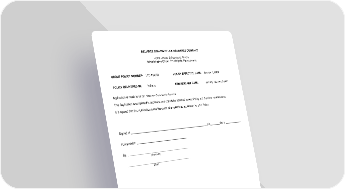 RELIANCE STANDARD LIFE INSURANCE COMPANY Home Office: Schaumburg, Illinois Administrative Office: Philadelphia, Pennsylvania GROUP POLICY NUMBER: LTD 134339 POLICY EFFECTIVE DATE: January 1, 2023 POLICY DELIVERED IN: Indiana ANNIVERSARY DATE: January 1st in each year Application is made to us by: Goshen Community Schools This Application is completed in duplicate, one copy to be attached to your Policy and the other returned to us. It is agreed that this Application takes the place of any previous application for your Policy. Signed at this day of . Policyholder: By: _____________________________________________ (Signature) ______________________________________________ (Title) Please sign and return. LRS-6564-1 Ed. 2/83 *BOD*