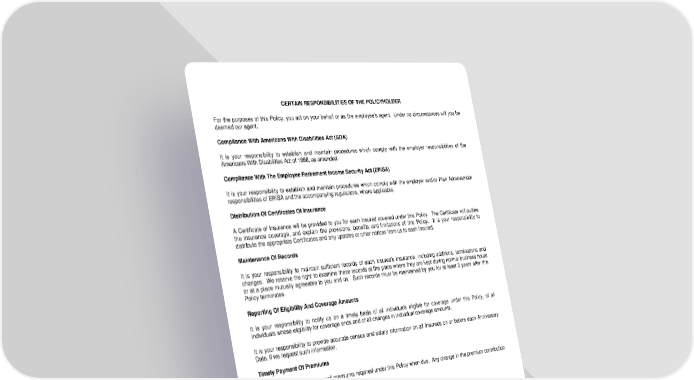 CERTAIN RESPONSIBILITIES OF THE POLICYHOLDER For the purposes of this Policy, you act on your behalf or as the employee's agent. Under no circumstances will you be deemed our agent. Compliance With Americans With Disabilities Act (ADA) It is your responsibility to establish and maintain procedures which comply with the employer responsibilities of the Americans With Disabilities Act of 1990, as amended. Compliance With The Employee Retirement Income Security Act (ERISA) It is your responsibility to establish and maintain procedures which comply with the employer and/or Plan Administrator responsibilities of ERISA and the accompanying regulations, where applicable. Distribution Of Certificates Of Insurance A Certificate of Insurance will be provided to you for each Insured covered under this Policy. The Certificate will outline the insurance coverage, and explain the provisions, benefits and limitations of this Policy. It is your responsibility to distribute the appropriate Certificates and any updates or other notices from us to each Insured. Maintenance Of Records It is your responsibility to maintain sufficient records of each Insured's insurance, including additions, terminations and changes. We reserve the right to examine these records at the place where they are kept during normal business hours or at a place mutually agreeable to you and us. Such records must be maintained by you for at least 3 years after this Policy terminates. Reporting Of Eligibility And Coverage Amounts It is your responsibility to notify us on a timely basis of all individuals eligible for coverage under this Policy, of all individuals whose eligibility for coverage ends and of all changes in individual coverage amounts. It is your responsibility to provide accurate census and salary information on all Insureds on or before each Anniversary Date, if we request such information. Timely Payment Of Premiums It is your responsibility to pay all premiums required under this Policy when due. Any change in the premium contribution basis must be approved by us. LRS-6564-114-0406 Page 3.0