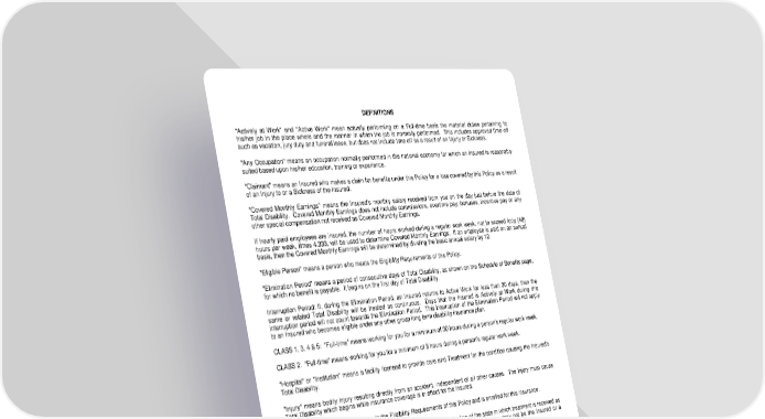 DEFINITIONS "Actively at Work" and "Active Work" mean actually performing on a Full-time basis the material duties pertaining to his/her job in the place where and the manner in which the job is normally performed. This includes approved time off such as vacation, jury duty and funeral leave, but does not include time off as a result of an Injury or Sickness. "Any Occupation" means an occupation normally performed in the national economy for which an Insured is reasonably suited based upon his/her education, training or experience. "Claimant" means an Insured who makes a claim for benefits under this Policy for a loss covered by this Policy as a result of an Injury to or a Sickness of the Insured. "Covered Monthly Earnings" means the Insured's monthly salary received from you on the day just before the date of Total Disability. Covered Monthly Earnings does not include commissions, overtime pay, bonuses, incentive pay or any other special compensation not received as Covered Monthly Earnings. If hourly paid employees are insured, the number of hours worked during a regular work week, not to exceed forty (40) hours per week, times 4.333, will be used to determine Covered Monthly Earnings. If an employee is paid on an annual basis, then the Covered Monthly Earnings will be determined by dividing the basic annual salary by 12. "Eligible Person" means a person who meets the Eligibility Requirements of this Policy. "Elimination Period" means a period of consecutive days of Total Disability, as shown on the Schedule of Benefits page, for which no benefit is payable. It begins on the first day of Total Disability. Interruption Period: If, during the Elimination Period, an Insured returns to Active Work for less than 30 days, then the same or related Total Disability will be treated as continuous. Days that the Insured is Actively at Work during this interruption period will not count towards the Elimination Period. This interruption of the Elimination Period will not apply to an Insured who becomes eligible under any other group long term disability insurance plan. CLASS 1, 3, 4 & 5: "Full-time" means working for you for a minimum of 30 hours during a person's regular work week. CLASS 2: "Full-time" means working for you for a minimum of 8 hours during a person's regular work week. "Hospital" or "Institution" means a facility licensed to provide care and Treatment for the condition causing the Insured's Total Disability. "Injury" means bodily Injury resulting directly from an accident, independent of all other causes. The Injury must cause Total Disability which begins while insurance coverage is in effect for the Insured. "Insured" means a person who meets the Eligibility Requirements of this Policy and is enrolled for this insurance. "Physician" means a duly licensed practitioner who is recognized by the law of the state in which treatment is received as qualified to treat the type of Injury or Sickness for which claim is made. The Physician may not be the Insured or a member of his/her immediate family. "Premium" means the amount of money needed to keep this Policy in force. "Regular Care" means Treatment that is administered as frequently as is medically required according to guidelines established by nationally recognized authorities, medical research, healthcare organizations, governmental agencies or rehabilitative organizations. Care must be rendered personally by the Insured's Physician according to generally accepted medical standards in the Insured's locality, be of a demonstrable medical value and be necessary to meet his/her basic health needs. "Regular Occupation" means the occupation the Insured is routinely performing when Total Disability begins. We will look at the Insured's occupation as it is normally performed in the national economy, and not the unique duties performed for a specific employer or in a specific locale. LRS-6564-4-0406 Page 2.0