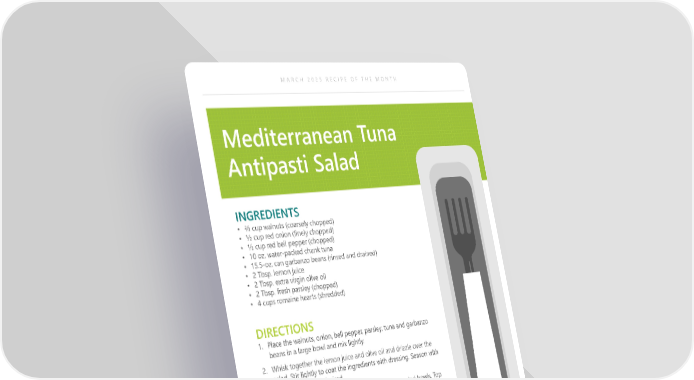 MARCH 2025 RECIPE OF THE MONTH Mediterranean Tuna Antipasti Salad INGREDIENTS • ⅔ cup walnuts (coarsely chopped) • ½ cup red onion (finely chopped) • ½ cup red bell pepper (chopped) • 10 oz. water-packed chunk tuna • 15.5-oz. can garbanzo beans (rinsed and drained) • 2 Tbsp. lemon juice • 2 Tbsp. extra virgin olive oil • 2 Tbsp. fresh parsley (chopped) • 4 cups romaine hearts (shredded) DIRECTIONS 1. Place the walnuts, onion, bell pepper, parsley, tuna and garbanzo beans in a large bowl and mix lightly. 2. Whisk together the lemon juice and olive oil and drizzle over the salad. Stir lightly to coat the ingredients with dressing. Season with salt and pepper, if desired. 3. Place the lettuce on a platter or divide it between salad bowls. Top with equal amounts of salad. Makes: 4 Servings NUTRITIONAL INFORMATION (1 Serving) Calories 405 Dietary Fiber 9 g Total fat 23 g Total sugars 6 g Saturated Fat 3 g Added Sugars Included 0 g Sodium 362 mg Protein 25 g Carbohydrate 29 g