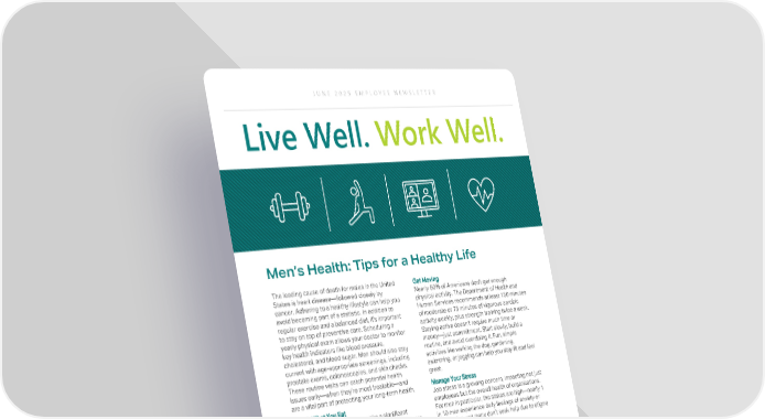 J U N E 2 0 2 5 E M P L O Y E E N E W S L E T T E R Live Well. Work Well. The leading cause of death for males in the United States is heart disease—followed closely by cancer. Adhering to a healthy lifestyle can help you avoid becoming part of a statistic. In addition to regular exercise and a balanced diet, it's important to stay on top of preventive care. Scheduling a yearly physical exam allows your doctor to monitor key health indicators like blood pressure, cholesterol, and blood sugar. Men should also stay current with age-appropriate screenings, including prostate exams, colonoscopies, and skin checks. These routine visits can catch potential health issues early—when they’re most treatable—and are a vital part of protecting your long-term health. Watch What You Eat What you eat and drink can make a significant difference in your overall health. Eating five or more servings of fruits and vegetables a day, little saturated fat and no trans fats can improve your health and reduce your risk of developing heart disease and other chronic diseases. Know Your Risks Your genetics, environment and lifestyle all contribute to your health. These factors may put you at an increased risk for developing certain diseases or conditions. Since you can’t change some of those factors (like your genes), focus on addressing any behaviors you do have control over, such as your diet, activity level and smoking. Make as many changes as you can to improve your well-being. Get Moving Nearly 80% of Americans don't get enough physical activity. The Department of Health and Human Services recommends at least 150 minutes of moderate or 75 minutes of vigorous aerobic activity weekly, plus strength training twice a week. Staying active doesn’t require much time or money—just commitment. Start slowly, build a routine, and avoid overdoing it. Fun, simple activities like walking the dog, gardening, swimming, or jogging can help you stay fit and feel great. Manage Your Stress Job stress is a growing concern, impacting not just employees but the overall health of organizations. For men in particular, the stakes are high—nearly 1 in 10 men experience daily feelings of anxiety or depression, yet many don’t seek help due to stigma or societal pressures. Additionally, men account for nearly 80% of all suicide deaths in the U.S., highlighting a critical need to prioritize mental well-being. Men’s Health: Tips for a Healthy Life Research shows that 1 in 10 men experiences daily feelings of anxiety and depression.