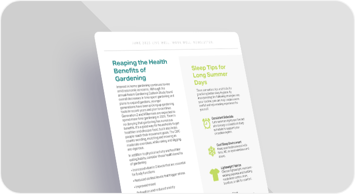 J U N E 2 0 2 5 L I V E W E L L . W O R K W E L L . N E W S L E T T E R : Reaping the Health Benefits of Gardening Interest in home gardening continues to rise amid economic concerns. Although the annual Axiom Gardening Outlook Study found overall decreases in time spent gardening and plans to expand gardens, younger generations have been picking up gardening tools in recent years and plan to continue. Generation Z and Millennials are expected to spend more time gardening in 2025. There’s no denying that gardening has numerous benefits. It’s a good way for households to get healthier and cheaper food, but it also helps people reach their movement goals. The CDC counts weeding, mulching and mowing as moderate exercises, while raking and digging are vigorous. In addition to physical activity and healthier eating habits, consider these health benefits of gardening: • Increased vitamin D levels that are essential for body functions • Reduced cortisol levels that trigger stress • Improved mood • Relaxation and reduced anxiety • Boosted self-esteem If you haven’t started gardening yet, it’s not too late to start and reap the benefits of time outside. Talk to your doctor to learn more about ways to manage your well-being. Sleep Tips for Long Summer Days Consistent Schedule Late summer nights are fine but aim to keep a consistent sleep schedule to support your circadian rhythm. Cool Sleep Environment Keep your bedroom cool with fans, AC, or open windows and doors. Lightweight Fabrics Choose lightweight, moisture- wicking pajamas and bedding made from cotton, linen, bamboo, or silk for comfort. Sleep Mask Longer daylight can disrupt sleep; a sleep mask helps create darkness, while experts advise against blackout curtains to allow some natural light cues. Stay Hydrated Stay hydrated by drinking water throughout the day but avoid large amounts before bed to prevent nighttime bathroom trips. There are various tips and tricks for practicing better sleep hygiene. By incorporating the following strategies into your routine, you can help create a more restful and rejuvenating experience for yourself.