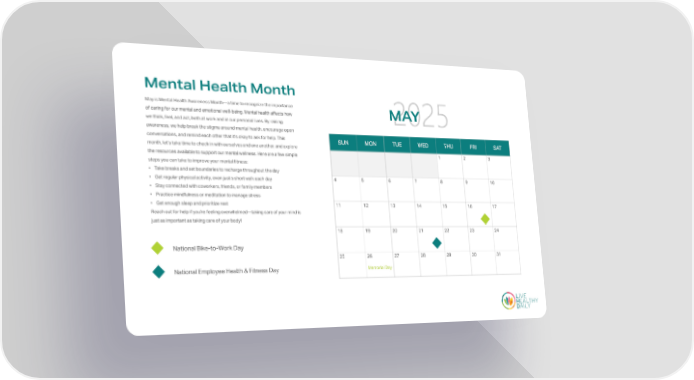 SUN MON TUE WED THU FRI SAT 1 2 3 4 5 6 7 8 9 10 11 12 13 14 15 16 17 18 19 20 21 22 23 24 25 26 Memorial Day 27 28 29 30 31 MAY Mental Health Month National Bike-to-Work Day National Employee Health & Fitness Day May is Mental Health Awareness Month—a time to recognize the importance of caring for our mental and emotional well-being. Mental health affects how we think, feel, and act, both at work and in our personal lives. By raising awareness, we help break the stigma around mental health, encourage open conversations, and remind each other that it’s okay to ask for help. This month, let’s take time to check in with ourselves and one another, and explore the resources available to support our mental wellness. Here are a few simple steps you can take to improve your mental fitness: • Take breaks and set boundaries to recharge throughout the day • Get regular physical activity, even just a short walk each day • Stay connected with coworkers, friends, or family members • Practice mindfulness or meditation to manage stress • Get enough sleep and prioritize rest Reach out for help if you’re feeling overwhelmed—taking care of your mind is just as important as taking care of your body!