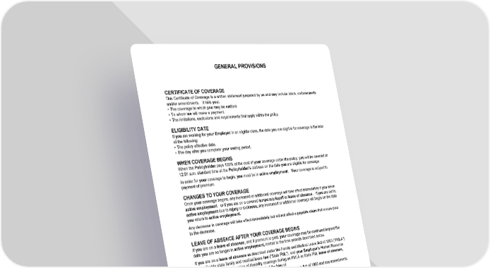 GENERAL PROVISIONS HC13GPIN 10 B-21113 (11/25) CERTIFICATE OF COVERAGE This Certificate of Coverage is a written statement prepared by us and may include riders, endorsements and/or amendments. It tells you: • The coverage to which you may be entitled. • To whom we will make a payment. • The limitations, exclusions and requirements that apply within the policy. ELIGIBILITY DATE If you are working for your Employer in an eligible class, the date you are eligible for coverage is the later of the following: • The policy effective date. • The day after you complete your waiting period. WHEN COVERAGE BEGINS When the Policyholder pays 100% of the cost of your coverage under the policy, you will be covered at 12:01 a.m. standard time at the Policyholder's address on the date you are eligible for coverage. In order for your coverage to begin, you must be in active employment. Your coverage is subject to payment of premium. CHANGES TO YOUR COVERAGE Once your coverage begins, any increased or additional coverage will take effect immediately if you are in active employment or if you are on a covered temporary layoff or leave of absence. If you are not in active employment due to injury or sickness, any increased or additional coverage will begin on the date you return to active employment. Any decrease in coverage will take effect immediately but will not affect a payable claim that occurs prior to the decrease. LEAVE OF ABSENCE AFTER YOUR COVERAGE BEGINS If you are on a leave of absence, and if premium is paid, your coverage may be continued beyond the date you are no longer in active employment, limited to the time periods described below. If you are on a leave of absence as described under the Family and Medical Leave Act of 1993 ("FMLA") or applicable state family and medical leave law ("State FML"), and your Employer's Human Resource Policy provides for continuation of disability coverage during an FMLA or State FML leave of absence, your coverage will be continued until the end of the later of: • The leave period permitted by the federal Family and Medical Leave Act of 1993 and any amendments. • The leave period permitted by applicable state law. If you are on a leave of absence other than an FMLA or State FML leave of absence, and if premium is paid, your coverage will be continued through the end of the 2 months that immediately follows the month in which your leave of absence begins. If you are on a leave of absence for active military service as described under the Uniformed Services Employment and Reemployment Rights Act of 1994 (USERRA) and applicable state law, your coverage may be continued until the end of the later of: • The length of time the coverage may be continued under the Certificate of Coverage for an FMLA or State FML leave of absence. • The length of time the coverage may be continued under the Certificate of Coverage for a leave of absence other than an FMLA or State FML leave of absence. If your Employer has approved more than one type of leave of absence for you during any one period that you are not in active employment, we will consider such leaves to be concurrent for the purpose of determining how long your coverage may continue under the policy.