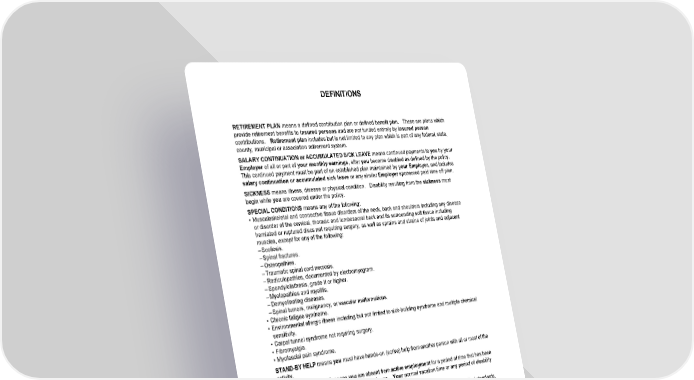 DEFINITIONS HC13GPIN 9 B-21113 (11/25) RETIREMENT PLAN means a defined contribution plan or defined benefit plan. These are plans which provide retirement benefits to insured persons and are not funded entirely by insured person contributions. Retirement plan includes but is not limited to any plan which is part of any federal, state, county, municipal or association retirement system. SALARY CONTINUATION or ACCUMULATED SICK LEAVE means continued payments to you by your Employer of all or part of your monthly earnings, after you become disabled as defined by the policy. This continued payment must be part of an established plan maintained by your Employer, and includes salary continuation or accumulated sick leave or any similar Employer sponsored paid time off plan. SICKNESS means illness, disease or physical condition. Disability resulting from the sickness must begin while you are covered under the policy. SPECIAL CONDITIONS means any of the following: • Musculoskeletal and connective tissue disorders of the neck, back and shoulders including any disease or disorder of the cervical, thoracic and lumbosacral back and its surrounding soft tissue including herniated or ruptured discs not requiring surgery, as well as sprains and strains of joints and adjacent muscles, except for any of the following: – Scoliosis. – Spinal fractures. – Osteopathies. – Traumatic spinal cord necrosis. – Radiculopathies, documented by electromyogram. – Spondylolisthesis, grade II or higher. – Myelopathies and myelitis. – Demyelinating diseases. – Spinal tumors, malignancy, or vascular malformations. • Chronic fatigue syndrome. • Environmental allergic illness including but not limited to sick-building syndrome and multiple chemical sensitivity. • Carpal tunnel syndrome not requiring surgery. • Fibromyalgia. • Myofascial pain syndrome. STAND-BY HELP means you must have hands-on (active) help from another person with all or most of the activity. TEMPORARY LAYOFF means you are absent from active employment for a period of time that has been agreed to in advance in writing by your Employer. Your normal vacation time or any period of disability is not considered a temporary layoff. TERMINAL ILLNESS means a diagnosed illness that, according to generally accepted medical standards, is expected to result in death within 12 months. VOCATIONAL REHABILITATION PLAN means a written plan that a vocational rehabilitation professional, designated by us, prepares in accordance with the VOCATIONAL REHABILITATION SERVICES provision of the certificate. WAITING PERIOD means the continuous period of time (shown in the BENEFITS AT A GLANCE) that you must be in active employment in an eligible class before you are eligible for coverage under the policy. WE, US and OUR means ReliaStar Life Insurance Company. YOU and YOUR means a person who is eligible for coverage under the policy.