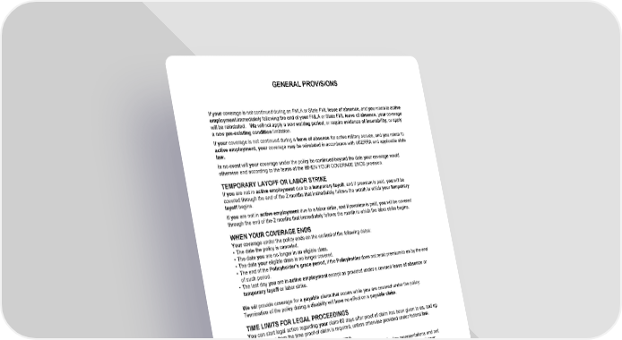 GENERAL PROVISIONS HC13GPIN 11 B-21113 (11/25) If your coverage is not continued during an FMLA or State FML leave of absence, and you return to active employment immediately following the end of your FMLA or State FML leave of absence, your coverage will be reinstated. We will not apply a new waiting period, or require evidence of insurability, or apply a new pre-existing condition limitation. If your coverage is not continued during a leave of absence for active military service, and you return to active employment, your coverage may be reinstated in accordance with USERRA and applicable state law. In no event will your coverage under the policy be continued beyond the date your coverage would otherwise end according to the terms of the WHEN YOUR COVERAGE ENDS provision. TEMPORARY LAYOFF OR LABOR STRIKE If you are not in active employment due to a temporary layoff, and if premium is paid, you will be covered through the end of the 2 months that immediately follows the month in which your temporary layoff begins. If you are not in active employment due to a labor strike, and if premium is paid, you will be covered through the end of the 2 months that immediately follows the month in which the labor strike begins. WHEN YOUR COVERAGE ENDS Your coverage under the policy ends on the earliest of the following dates: • The date the policy is canceled. • The date you are no longer in an eligible class. • The date your eligible class is no longer covered. • The end of the Policyholder's grace perio d, if the Policyholder does not remit premium to us by the end of such period. • The last day you are in active employment except as provided under a covered leave of absence or temporary layoff or labor strike. We will provide coverage for a payable claim that occurs while you are covered under the policy. Termination of the policy during a disability will have no effect on a payable claim. TIME LIMITS FOR LEGAL PROCEEDINGS You can start legal action regarding your claim 60 days after proof of claim has been given to us, and up to three years from the time proof of claim is required, unless otherwise provided under federal law. REPRESENTATIONS NOT WARRANTIES We consider any statements the Policyholder and you make in an application representations and not warranties. No statements made by you will be used to reduce or deny any claim or to cancel your coverage unless both of the following are true: • The statement is in writing and is signed by you. • A copy of that statement is given to you or your beneficiary, or your personal representative. INCONTESTABILITY Except in the case of fraud, no statement made by you in the application relating to your insurability will be used to contest the insurance for which the statement was made after the coverage has been in force for two years during your lifetime. Beyond the periods stated in the PRE-EXISTING CONDITION LIMITATION provision, no claim for disability with respect to which the claim is made shall be reduced or denied on the ground that a disease or physical condition, not excluded from coverage by name or specific description effective on the date of disability, had existed prior to the effective date of the coverage.