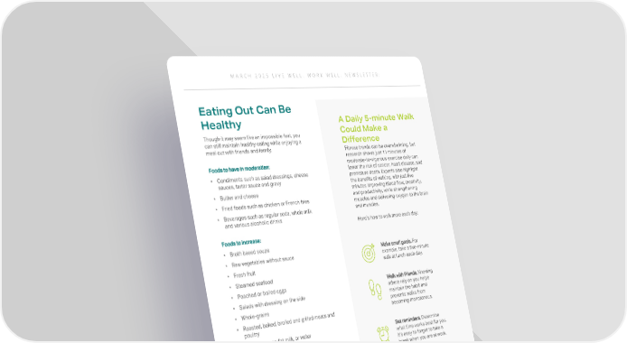 MARCH 2025 LIVE WELL. WORK WELL. NEWSLETTER: Eating Out Can Be A Daily 5-minute Walk Healthy Could Make a Though it may seem like an impossible feat, you can still maintain healthy eating while enjoying a Difference meal out with friends and family. Fitness trends can be overwhelming, but research shows just 11 minutes of Foods to have in moderation: moderate-to-vigorous exercise daily can • Condiments such as salad dressings, cheese lower the risk of cancer, heart disease, and sauces, tartar sauce and gravy premature death. Experts also highlight the benefits of walking, with just five • Butter and cheese minutes improving blood flow, creativity, • Fried foods such as chicken or French fries and productivity, while strengthening muscles and delivering oxygen to the brain • Beverages such as regular soda, whole milk and muscles. and various alcoholic drinks Here’s how to walk more each day: Foods to increase: • Broth based soups Make small goals. For • Raw vegetables without sauce example, take a five-minute • Fresh fruit walk at lunch each day. • Steamed seafood • Poached or boiled eggs Walk with friends. Knowing • Salads with dressing on the side others rely on you helps • Whole-grains maintain the habit and prevents walks from • Roasted, baked, broiled and grilled meats and becoming monotonous. poultry • Low-fat or non-fat milk, or water Set reminders. Determine • Yogurt what time works best for you. • Whole wheat tortillas It’s easy to forget to take a break when you are at work. To make dining out healthier, order food to go, Diversify your routine. Vary as people tend to eat less at home. Pair it with a your walking routes or healthy side dish and be mindful of portion sizes, alternate speeds to avoid as restaurant servings are often much larger boredom. than home portions. Listen to your body. Take breaks when needed and adjust your routine to maintain consistency.