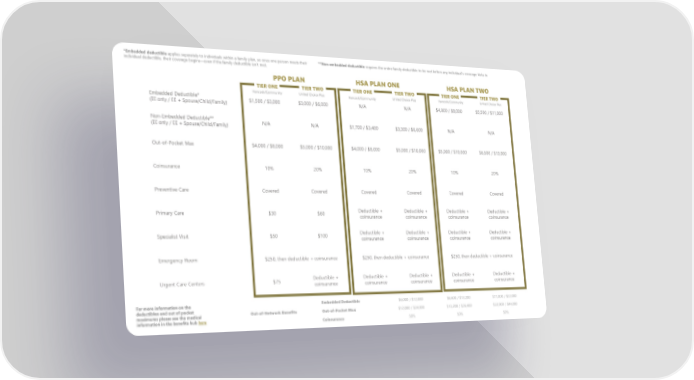 Embedded Deductible* (EE only / EE + Spouse/Child/Family) $1,500 / $3,000 $3,000 / $6,000 N/A N/A $4,000 / $8,000 $5,500 / $11,000 Non-Embedded Deductible** (EE only / EE + Spouse/Child/Family) N/A N/A $1,700 / $3,400 $3,300 / $6,600 N/A N/A Out-of-Pocket Max $4,000 / $8,000 $5,000 / $10,000 $4,000 / $8,000 $5,000 / $10,000 $5,000 / $10,000 $6,500 / $13,000 Coinsurance 10% 20% 10% 20% 10% 20% Preventive Care Covered Covered Covered Covered Covered Covered Primary Care $30 $60 Deductible + coinsurance Deductible + coinsurance Deductible + coinsurance Deductible + coinsurance Specialist Visit $50 $100 Deductible + coinsurance Deductible + coinsurance Deductible + coinsurance Deductible + coinsurance Emergency Room $250, then deductible + coinsurance $250, then deductible + coinsurance $250, then deductible + coinsurance Urgent Care Centers $75 Deductible + coinsurance Deductible + coinsurance Deductible + coinsurance Deductible + coinsurance Deductible + coinsurance PPO PLAN TIER ONE TIER TWO HSA PLAN ONE TIER ONE TIER TWO HSA PLAN TWO TIER ONE TIER TWO Out-of-Network Benefits Embedded Deductible $6,000 / $12,000 $6,600 / $13,200 $11,000 / $22,000 Out-of-Pocket Max $12,000 / $24,000 $13,200 / $26,400 $22,000 / $44,000 Coinsurance 50% 50% 50% *Embedded deductible applies separately to individuals within a family plan, so once one person meets their individual deductible, their coverage begins—even if the family deductible isn't met. For more information on the deductibles and out of pocket maximums please see the medical information in the benefits hub here Hancock/Community United Choice Plus United Choice Plus United Choice Plus Hancock/Community Hancock/Community **Non-embedded deductible requires the entire family deductible to be met before any individual’s coverage kicks in