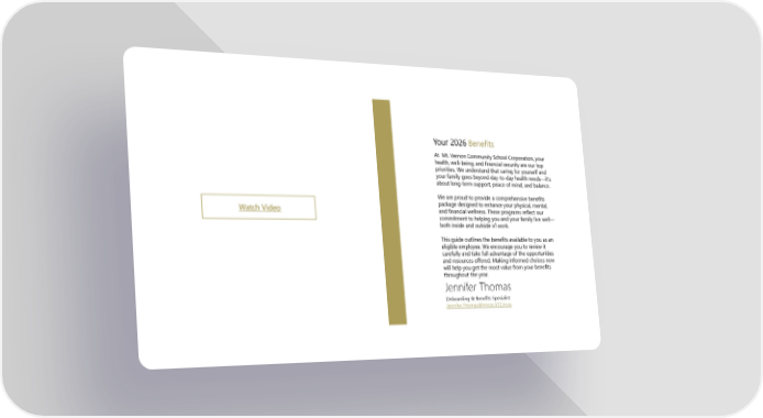 Jennifer Thomas Onboarding & Benefits Specialist [email protected] Your 2026 Benefits At Mt. Vernon Community School Corporation, your health, well-being, and financial security are our top priorities. We understand that caring for yourself and your family goes beyond day-to-day health needs—it’s about long-term support, peace of mind, and balance. We are proud to provide a comprehensive benefits package designed to enhance your physical, mental, and financial wellness. These programs reflect our commitment to helping you and your family live well— both inside and outside of work. This guide outlines the benefits available to you as an eligible employee. We encourage you to review it carefully and take full advantage of the opportunities and resources offered. Making informed choices now will help you get the most value from your benefits throughout the year. Watch Video