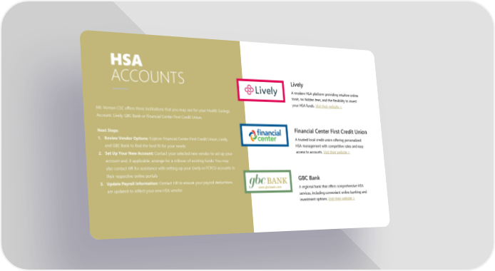 Mt. Vernon CSC offers three institutions that you may use for your Health Savings Account: Lively, GBC Bank or Financial Center First Credit Union. Next Steps: 1. Review Vendor Options: Explore Financial Center First Credit Union, Lively, and GBC Bank to find the best fit for your needs. 2. Set Up Your New Account: Contact your selected new vendor to set up your account and, if applicable, arrange for a rollover of existing funds. You may also contact HR for assistance with setting up your Lively or FCFCU accounts in their respective online portals 3. Update Payroll Information: Contact HR to ensure your payroll deductions are updated to reflect your new HSA vendor. HSA ACCOUNTS Lively A modern HSA platform providing intuitive online tools, no hidden fees, and the flexibility to invest your HSA funds. Visit their website > Financial Center First Credit Union A trusted local credit union offering personalized HSA management with competitive rates and easy access to accounts. Visit their website > GBC Bank A regional bank that offers comprehensive HSA services, including convenient online banking and investment options. Visit their website >