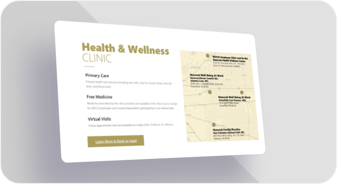 Health & Wellness CLINIC Learn More & Book an Appt Primary Care Primary health care services including sick visits, care for chronic illness, free lab tests, and blood work. Free Medicine Medicine prescribed by the clinic provides and available at the clinic is at no charge for MVCS employees and covered dependents participating in our medical plan. Virtual Visits Virtual appointment slots are available on Fridays from 12:00 p.m. to 3:00 p.m. Hancock Family Practice New Palestine (Chelsea Lock, NP) 4055 Roy Wilson Way, Ste. 110, New Palestine, IN 46163 MVCSC Employee Clinic next to the Hancock Health Wellness Center 8535 N. Clearview Drive, Ste. 700 (enter door #1), McCordsville, IN 46055 Hancock Well-Being At Work Gateway/Mount Comfort Rd. (Chelsea Lock, NP) 6189 John L. Modglin Drive, Suite 202, Greenfield, IN 46140 Hancock Well-Being At Work Greenfield (Lori Deemer, MD) 1515 North State Street, Greenfield, IN 46140
