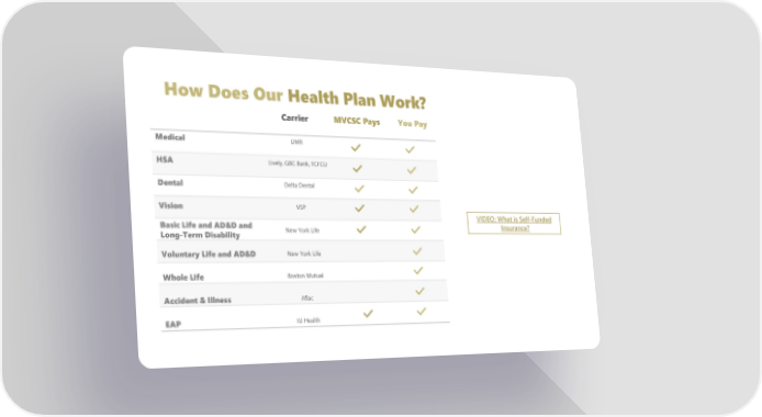 VIDEO: What is Self-Funded Insurance? How Does Our Health Plan Work? Carrier MVCSC Pays You Pay Medical UMR HSA Lively, GBC Bank, FCFCU Dental Delta Dental Vision VSP Basic Life and AD&D and Long-Term Disability New York Life Voluntary Life and AD&D New York Life Whole Life Boston Mutual Accident & Illness Aflac EAP IU Health