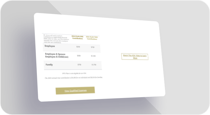 View Qualified Expenses Watch This HSA Video to Learn More PPO Plan is not eligible for an HSA. The 2025 annual max contribution is $4,300 for an individual and $8,550 for families. HSA PLAN ONE Contributions HSA PLAN TWO Contributions Employee $250 $750 Employee & Spouse Employee & Child(ren) $500 $1,250 Family $750 $1,750 Mt. Vernon will match employee contributions to Health Savings Accounts (HSAs) dollar for dollar, up to the maximum allowable limit, and only when employees make their own contributions.