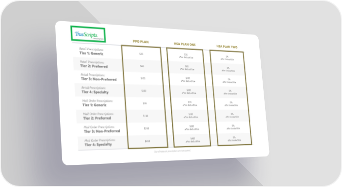 Retail Prescriptions: Tier 1: Generic $35 $35 after deductible 0% after deductible Retail Prescriptions: Tier 2: Preferred $65 $65 after deductible 0% after deductible Retail Prescriptions: Tier 3: Non-Preferred $100 $100 after deductible 0% after deductible Retail Prescriptions: Tier 4: Specialty $200 $200 after deductible 0% after deductible Mail Order Prescriptions: Tier 1: Generic $70 $70 after deductible 0% after deductible Mail Order Prescriptions: Tier 2: Preferred $130 $130 after deductible 0% after deductible Mail Order Prescriptions: Tier 3: Non-Preferred $200 $200 after deductible 0% after deductible Mail Order Prescriptions: Tier 4: Specialty $400 $400 after deductible 0% after deductible PPO PLAN HSA PLAN ONE HSA PLAN TWO Out-of-Network prescriptions are not covered.