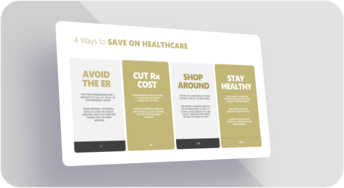 4 Ways to SAVE ON HEALTHCARE $ AVOID THE ER FOR TRUE EMERGENCIES DON’T HESITATE TO CALL 911 OR GO TO THE EMERGENCY ROOM. WHEN POSSIBLE, UTILIZING A WALK-IN CLINIC OR URGENT CARE WILL SAVE YOU TIME AND MONEY FOR THE SAME SERVICES. $$ CUT Rx COST COMPARE DRUG PRICES & TALK TO YOUR DOCTOR ABOUT LOWER COST OPTIONS. UTILIZE COUPONS & SERVICES LIKE GOODRx, Rx HELP CENTERS, OR THE COSTPLUS DRUG COMPANY. $$$ SHOP AROUND UTILIZE THE UMR PORTAL TO FIND THE BEST CARE AT THE BEST PRICE. LAB WORK & IMAGING SERVICES LIKE ULTRASOUNDS, X-RAYS, CT SCANS, BLOOD DRAWS, ETC. ARE COSTLY. RESEARCH PROVIDERS BEFORE YOU MAKE AN APPT. $$$$ STAY HEALTHY LIVE A HEALTHY LIFESTYLE THROUGH REGULAR MOVEMENT & HEALTHY EATING HABITS. REGULARLY VISIT YOUR PRIMIARY CARE PHYSICIAN. SCHEDULE YOUR ANNUAL PHYSICAL & PREVENTIVE CARE APPOINTMENTS.