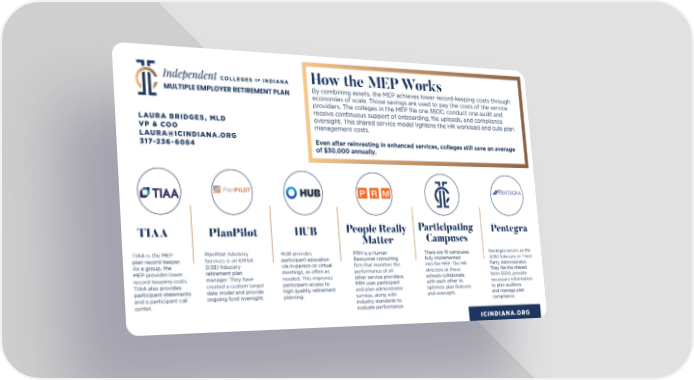 MULTIPLE EMPLOYER RETIREMENT PLAN TIAA is the MEP plan record keeper. As a group, the MEP provides lower record-keeping costs. TIAA also provides participant statements and a participant call center. TIAA PlanPilot Advisory Services is an ERISA 3(38) fiduciary retirement plan manager. They have created a custom target date model and provide ongoing fund oversight. PlanPilot HUB provides participant education via in-person or virtual meetings, as often as needed. This improves participant access to high qualitiy retirement planning. HUB PRM is a Human Resources consulting firm that monitors the performance of all other service providers. PRM uses participant and plan administrator surveys, along with industry standards to evaluate performance. People Really Matter There are 16 campuses fully implemented into the MEP. The HR directors at those schools collaborate with each other to optimize plan features and oversight. Participating Campuses Pentegra serves as the 3(16) fiduciary or Third- Party Administrator. They file the shared form 5500, provide necessary information to plan auditors and manage plan compliance. Pentegra By combining assets, the MEP achieves lower record-keeping costs through economies of scale. Those savings are used to pay the costs of the service providers. The colleges in the MEP file one 5500, conduct one audit and receive continuous support of onboarding, file uploads, and compliance oversight. This shared service model lightens the HR workload and cuts plan management costs. Even after reinvesting in enhanced services, colleges still save an average of $30,000 annually. How the MEP Works ICINDIANA.ORG LAURA BRIDGES, MLD VP & COO [email protected] 317-236-6084