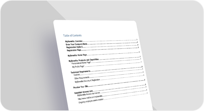 Table of Contents MyBenefits Overview .......................................................................................................................................3 Enter Your Company Name..............................................................................................................................3 Registration Options.........................................................................................................................................4 Registration Page..............................................................................................................................................5 MyBenefits Home Page...................................................................................................................................6 MyBenefits Products and Capabilities..........................................................................................................7 Personalized Home Page*....................................................................................................................................... 7 My Profile Page*......................................................................................................................................................... 7 Technical Requirements..................................................................................................................................8 Cookies....................................................................................................................................................................... 8 Other Requirements.................................................................................................................................................. 8 MyBenefits Security & Registration ........................................................................................................................ 8 Preview Your Site.............................................................................................................................................9 Establish Intranet Link ....................................................................................................................................9 MyBenefits Access via Internet:.............................................................................................................................. 9 http://www.metlife.com/mybenefits.......................................................................................................................... 9 Ongoing employee communication ........................................................................................................................ 9